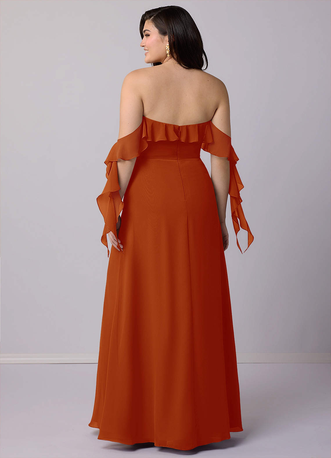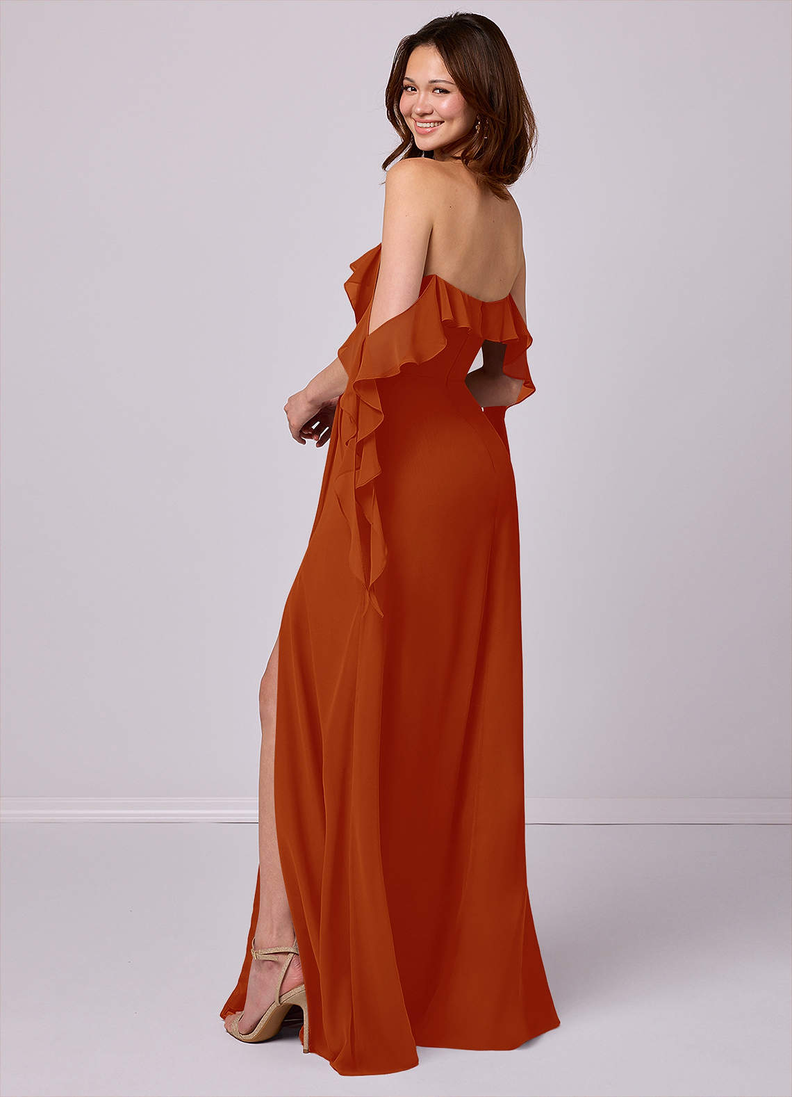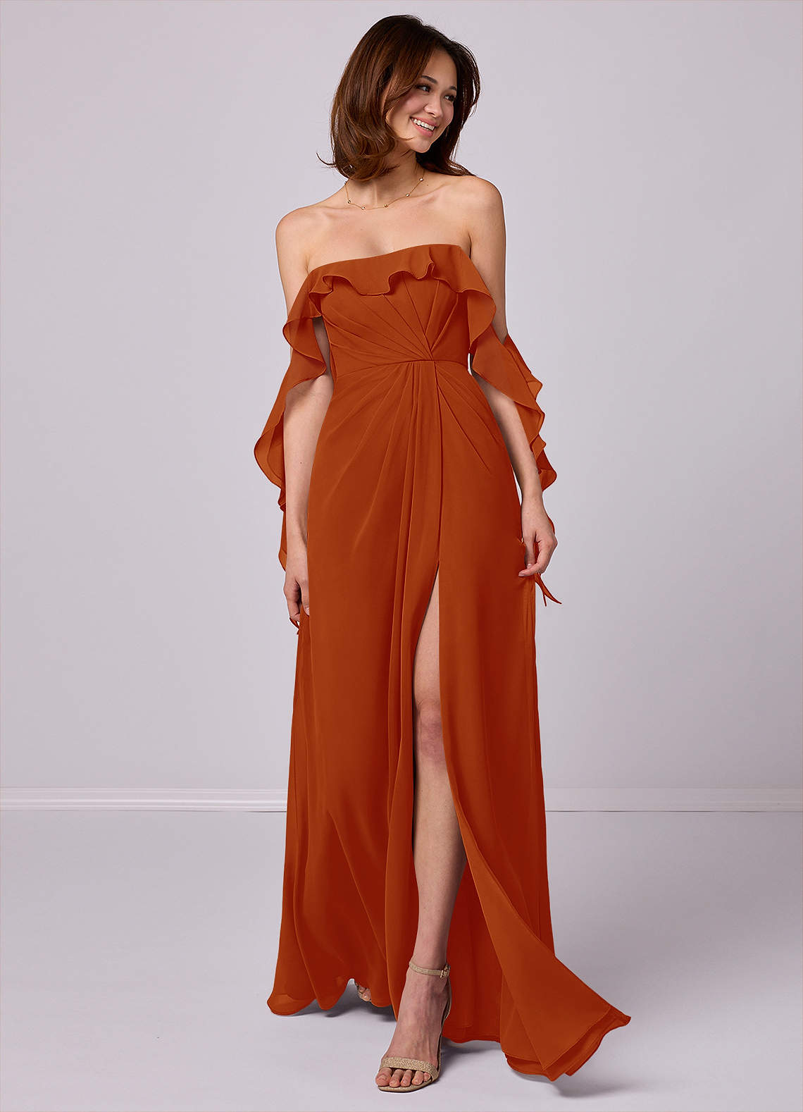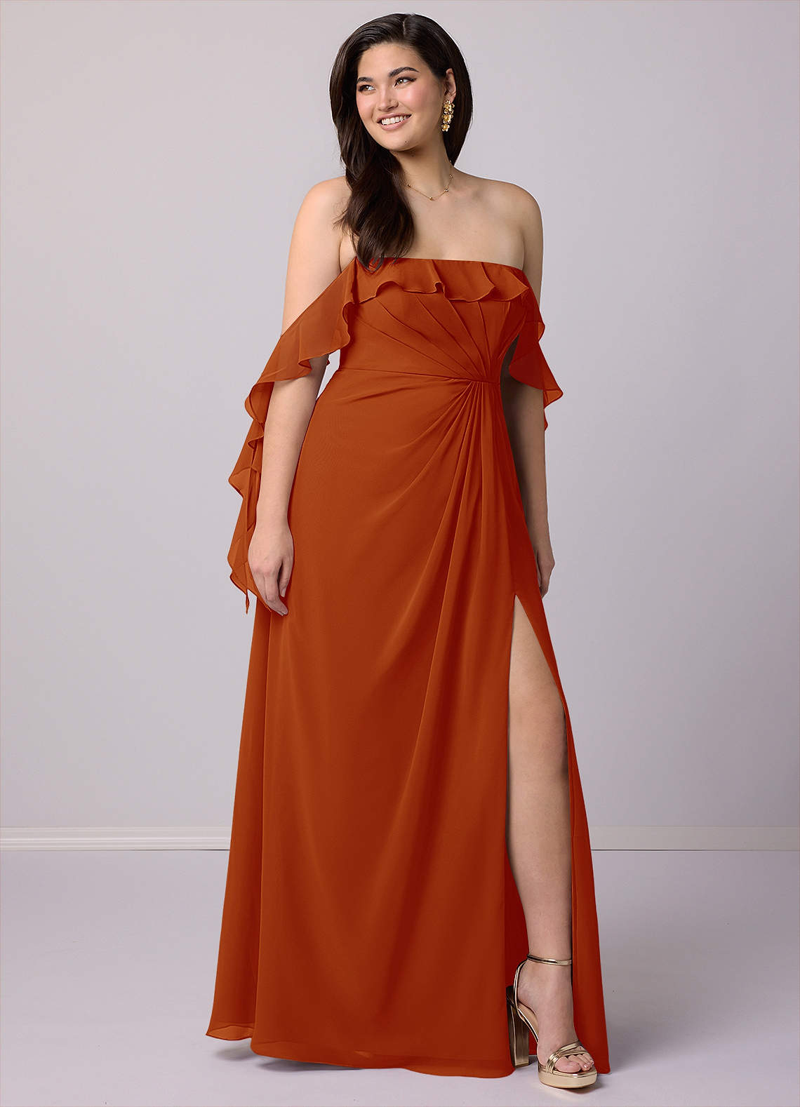 This floor length dress features a cascade scoop neckline, cascade off-shoulder details, delicate pleating, and a leg slit.