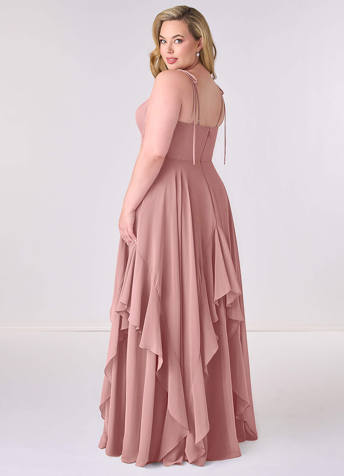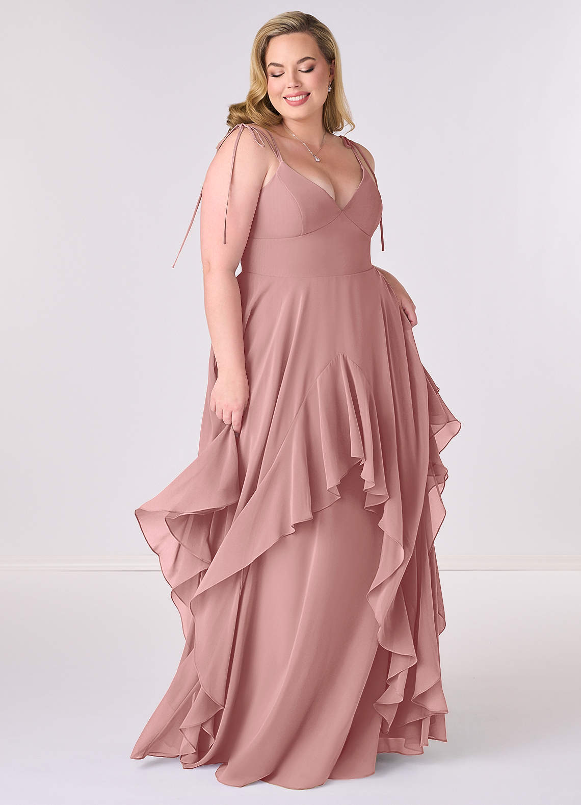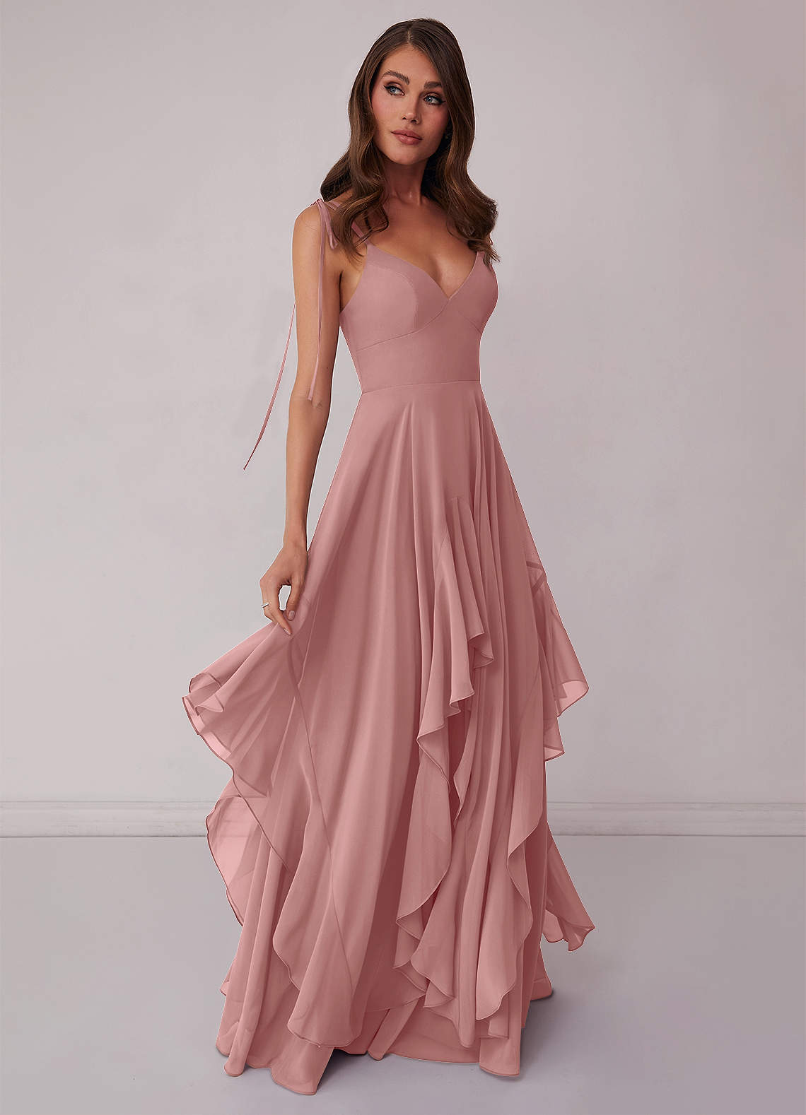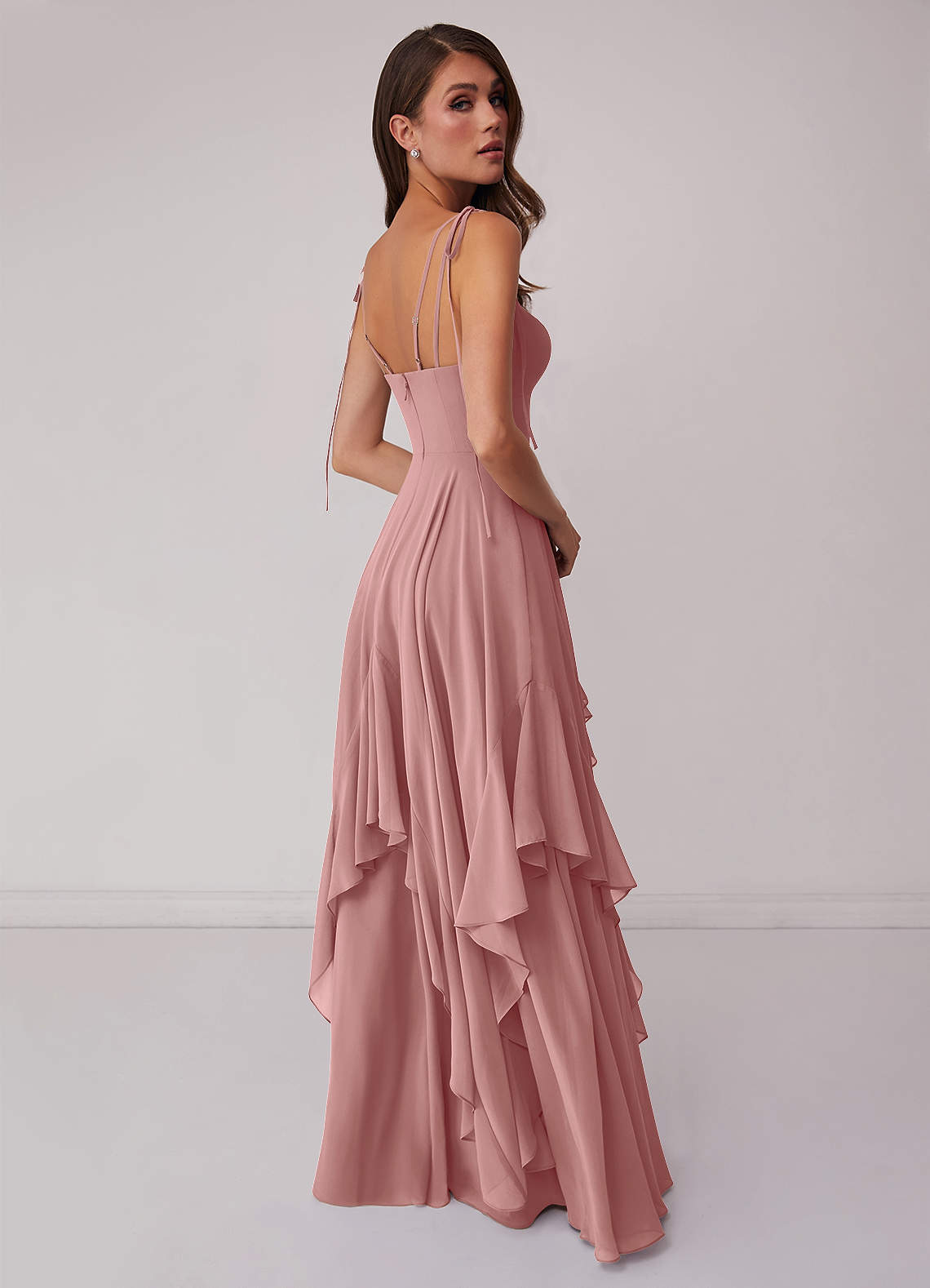 This flowy dress features double adjustable spaghetti straps with a bow tie at the shoulders and a ruffled tier handkerchief cut skirt.
