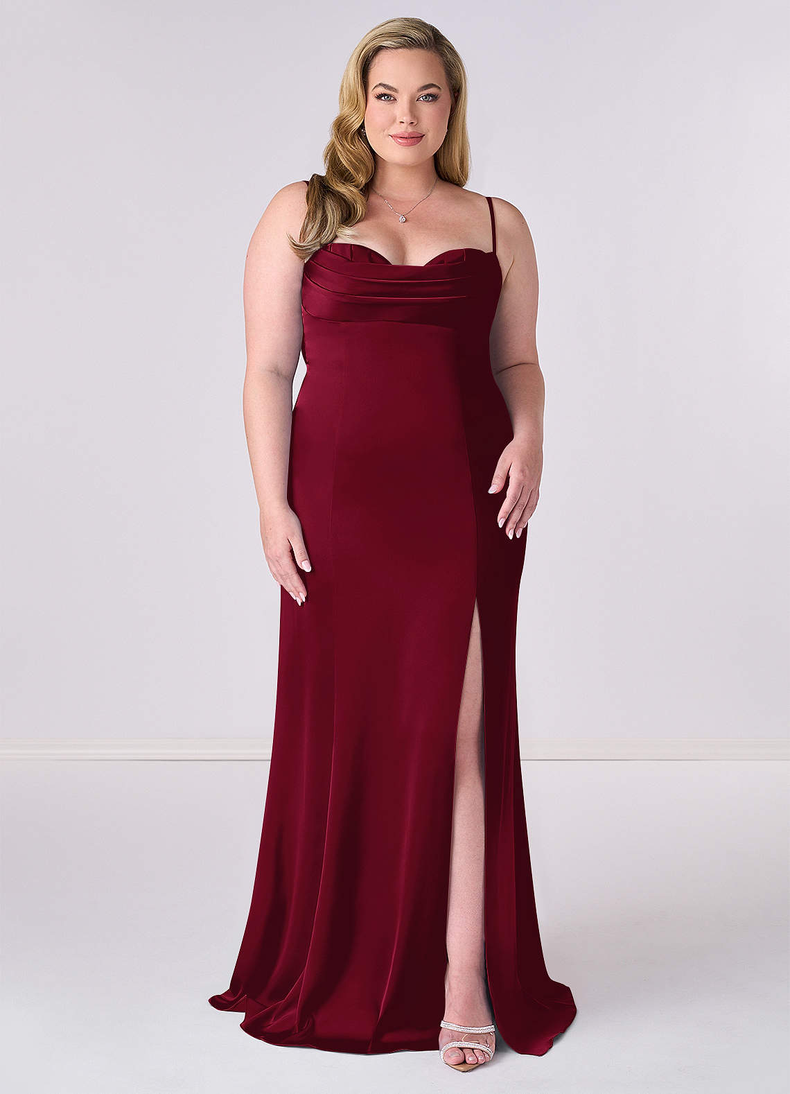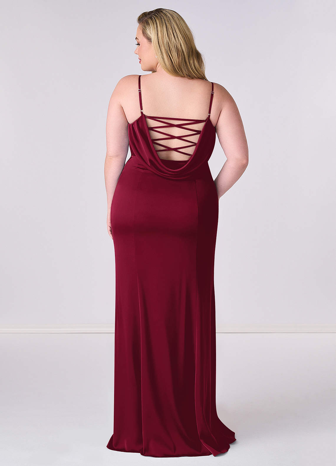 This floor length dress features a pleated sweetheart cowl neckline, dropped cowl back, leg slit, and a lace up corset style back bodice.