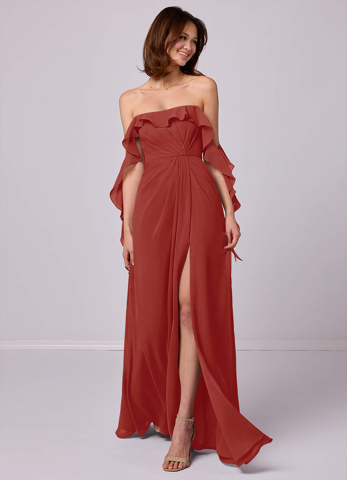 This floor length dress features a cascade scoop neckline, cascade off-shoulder details, delicate pleating, and a leg slit.