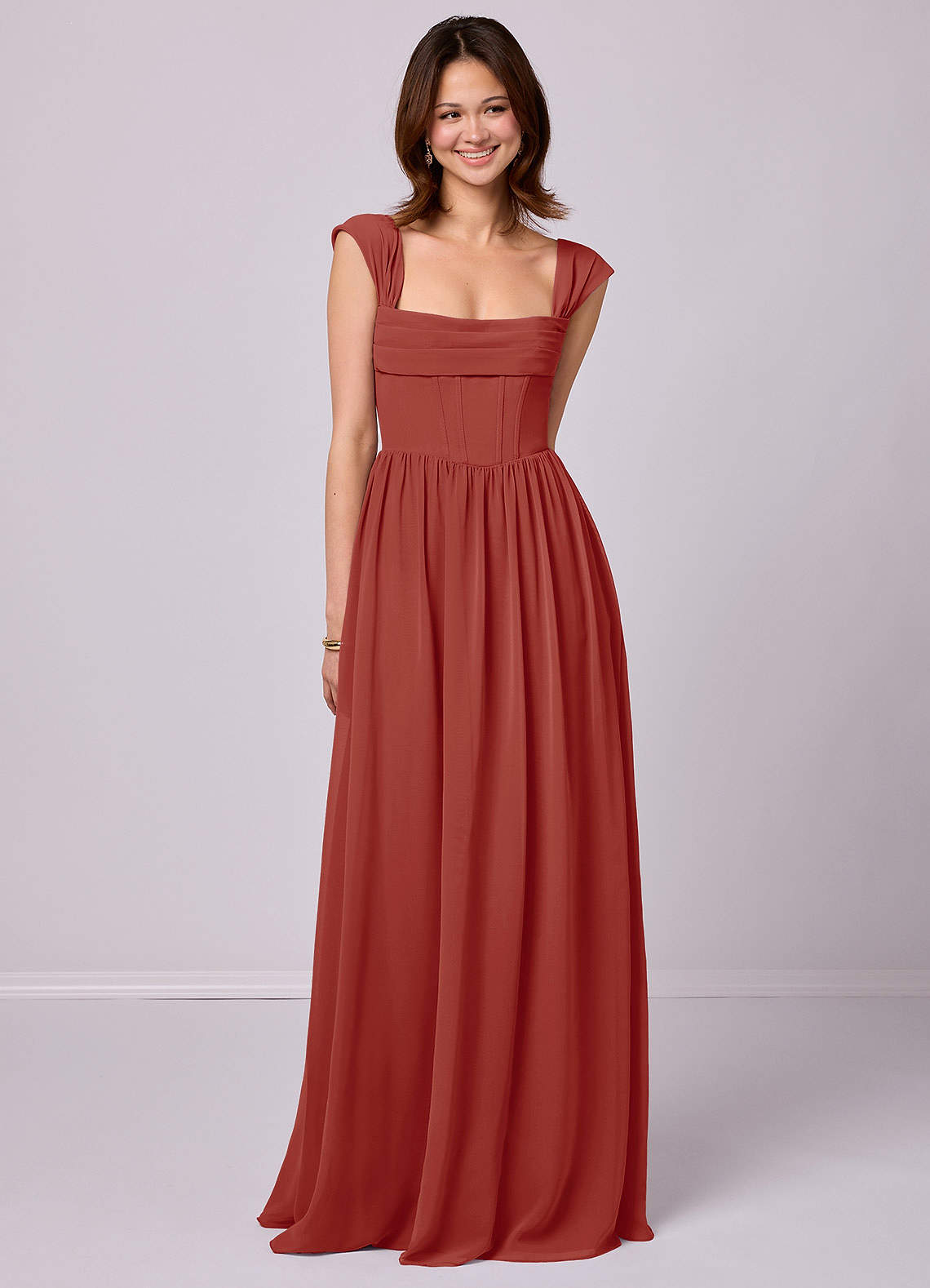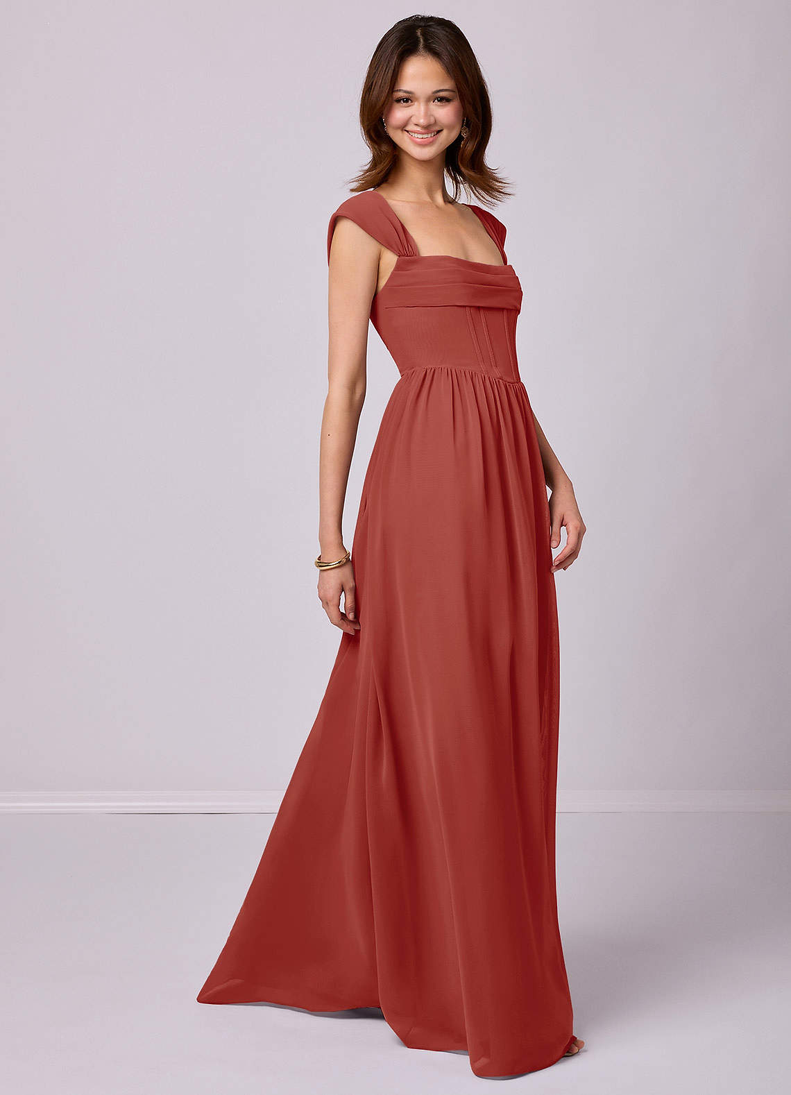 This floor length chiffon dress features a cowl neckline, ruched shoulder straps, a corseted bodice, a basque waistline, a ruched A-line skirt, and pockets.