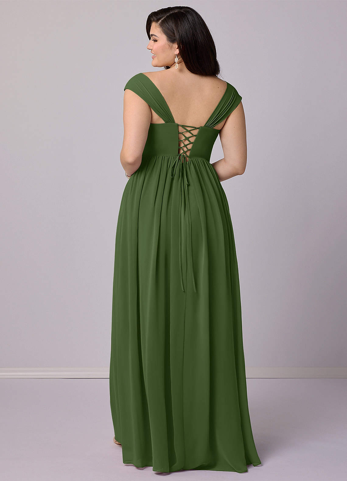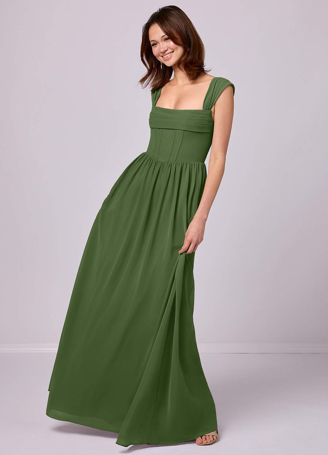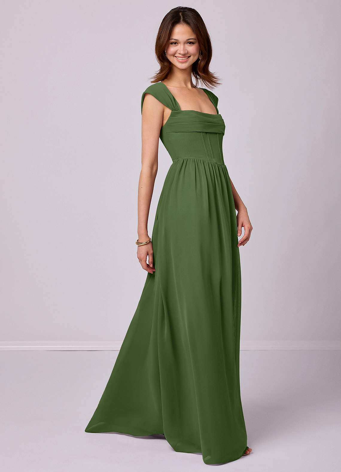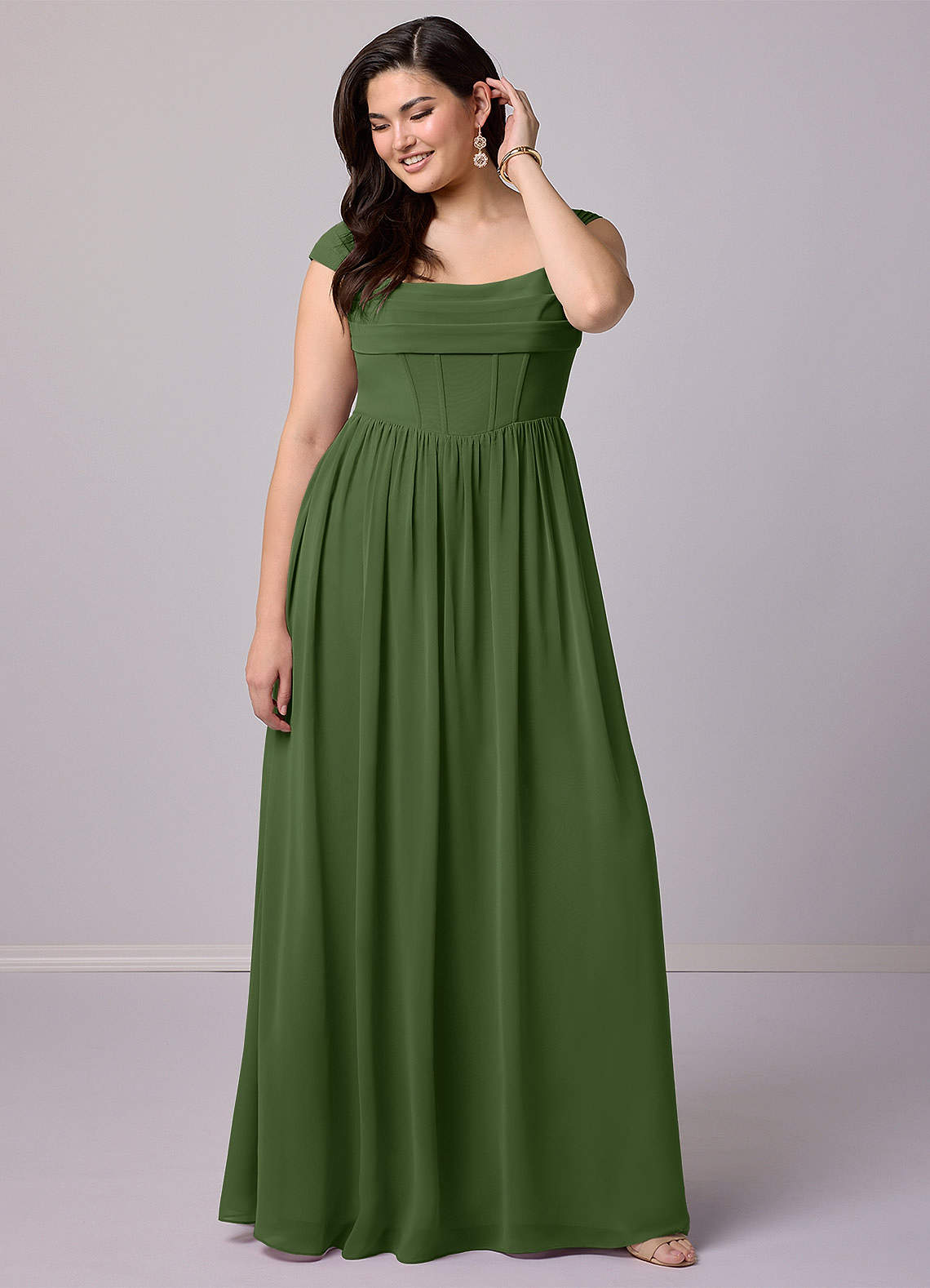 This floor length chiffon dress features a cowl neckline, ruched shoulder straps, a corseted bodice, a basque waistline, a ruched A-line skirt, and pockets.