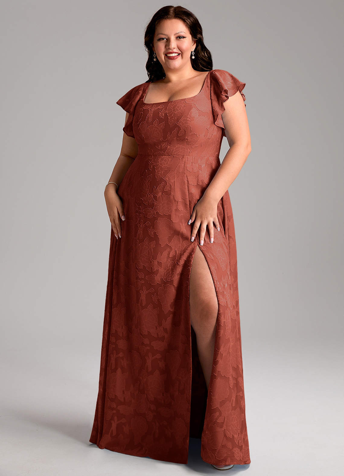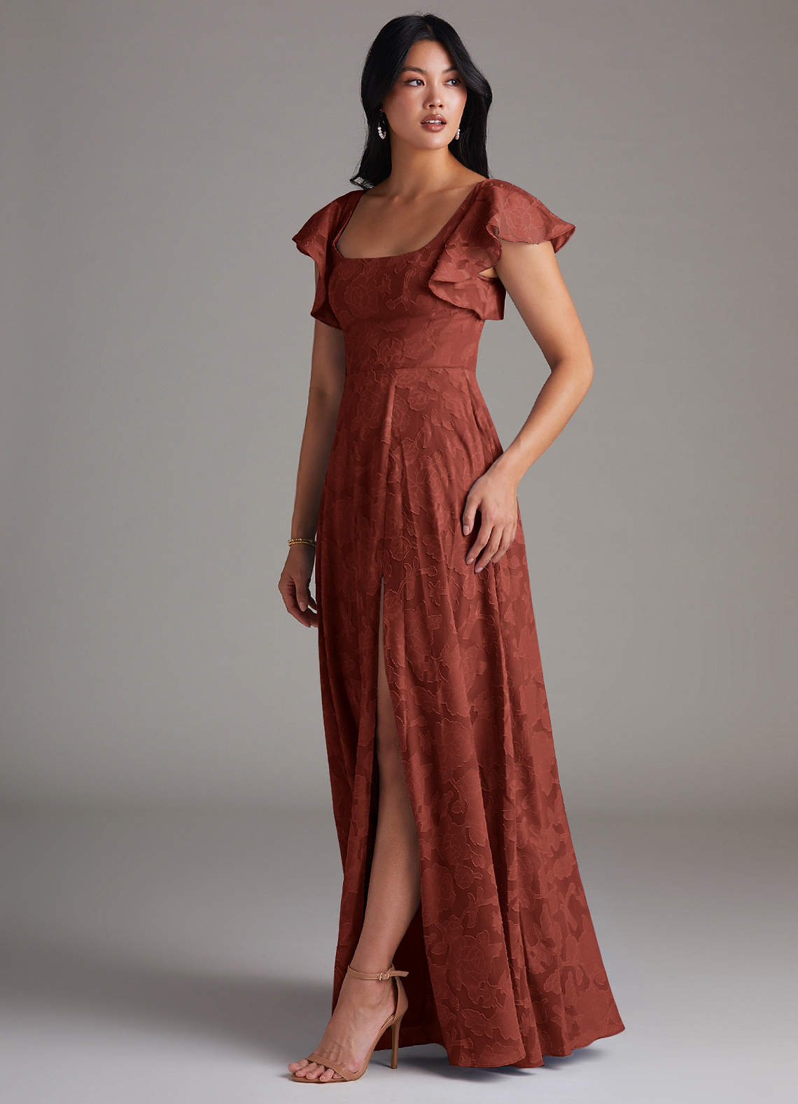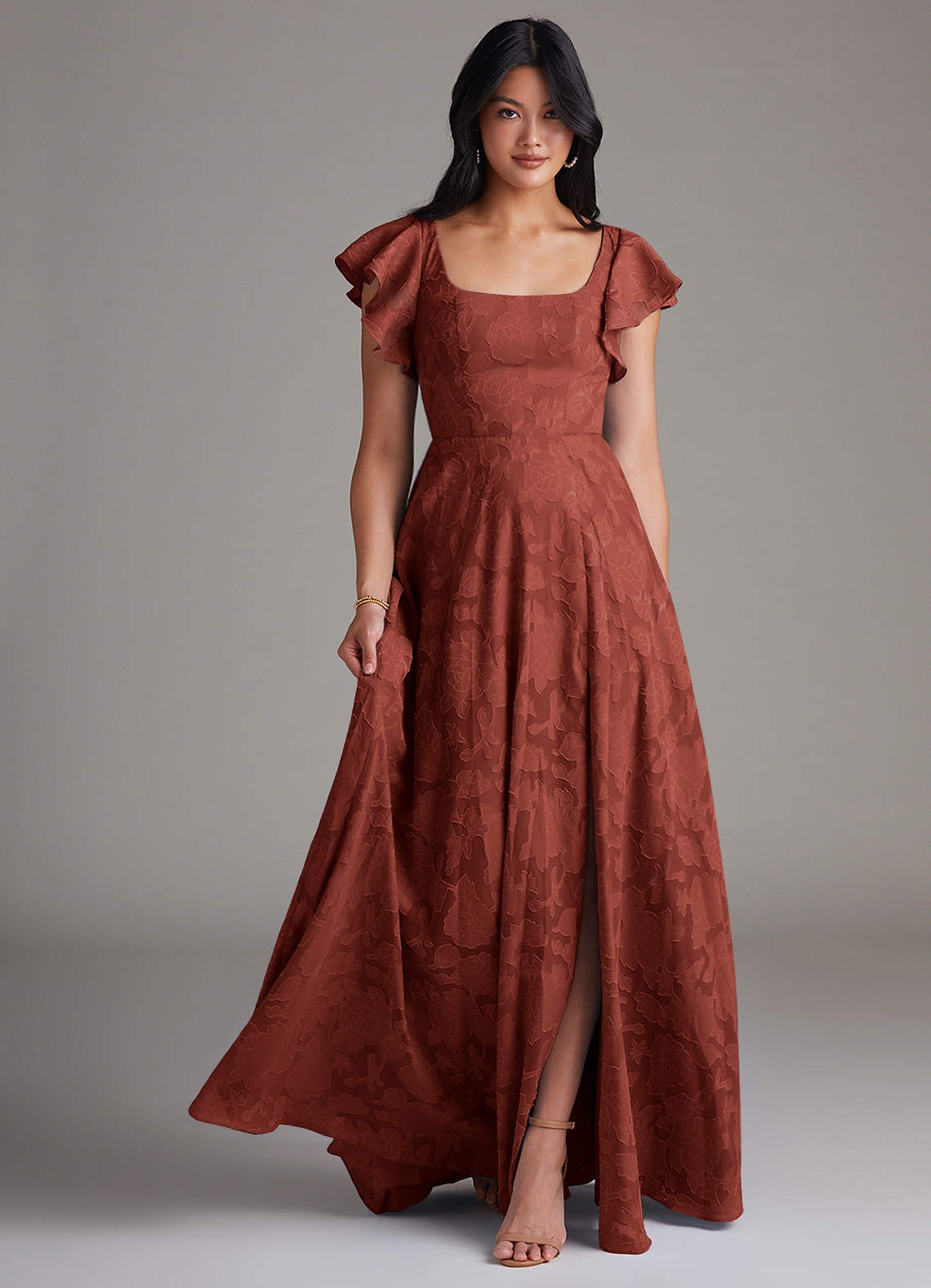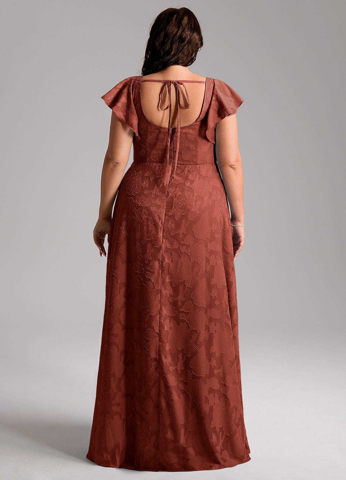 Bondi is our gorgeous bridesmaid dress cut from our floral burnout fabric. She features a square neckline with flutter sleeves and a self tie scoop back. The look is complete with an A-line skirt paired with a leg slit.
