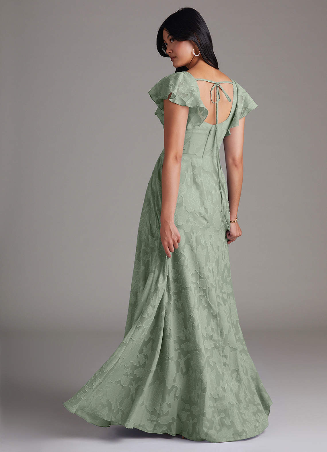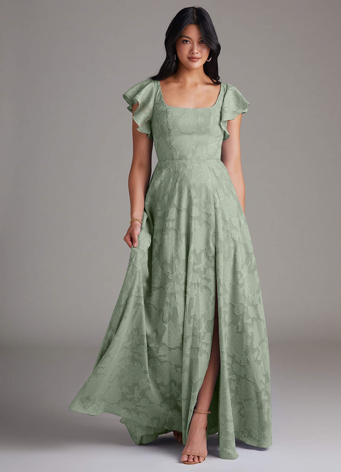 Bondi is our gorgeous bridesmaid dress cut from our floral burnout fabric. She features a square neckline with flutter sleeves and a self tie scoop back. The look is complete with an A-line skirt paired with a leg slit.