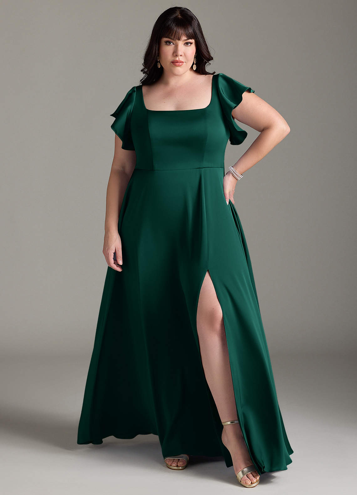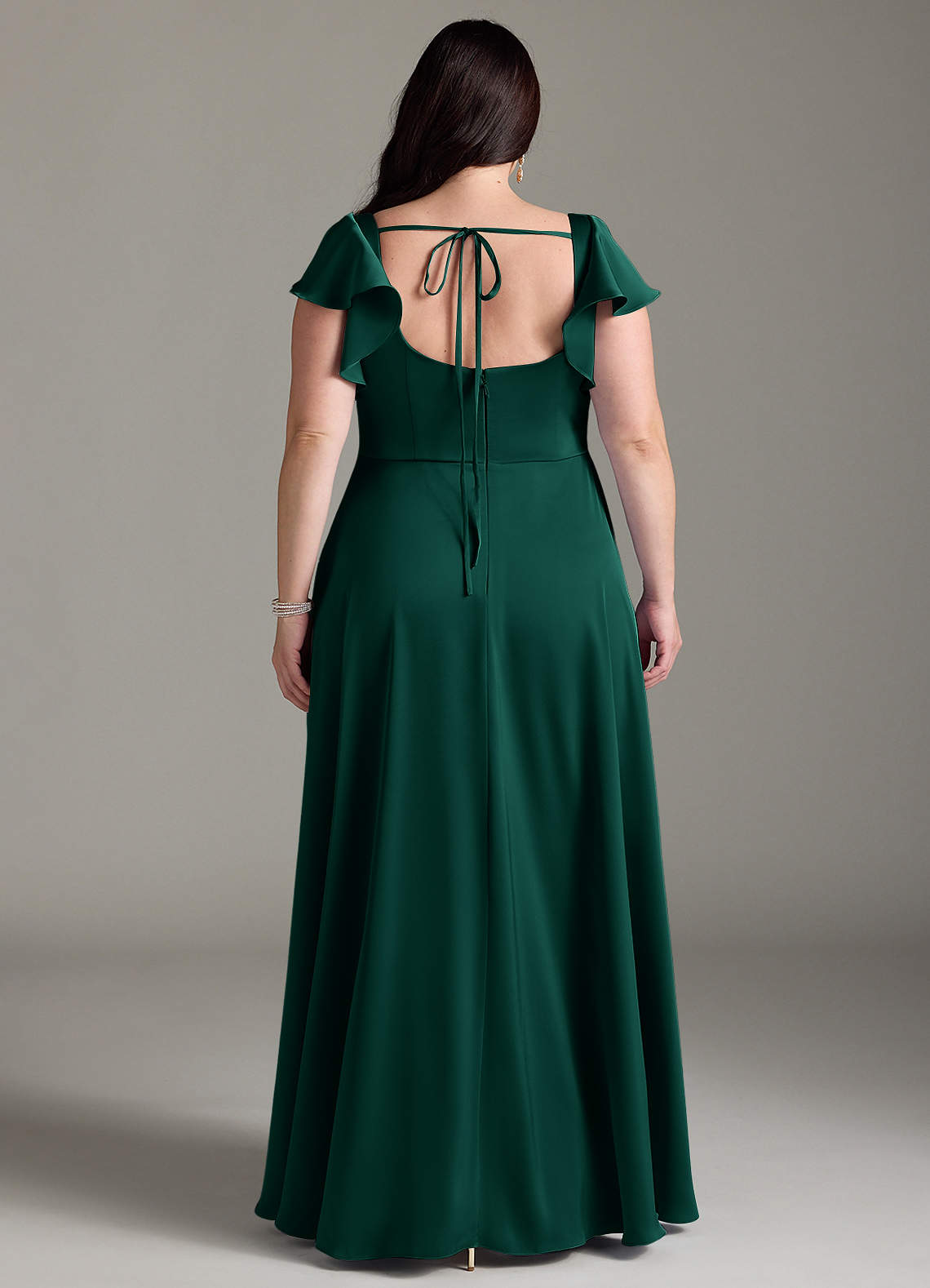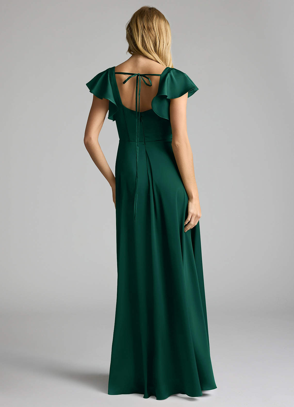 Bondi is our gorgeous bridesmaid dress cut from stretch satin. She features a square neckline with flutter sleeves and a self tie scoop back. The look is complete with an A-line skirt paired with a leg slit.