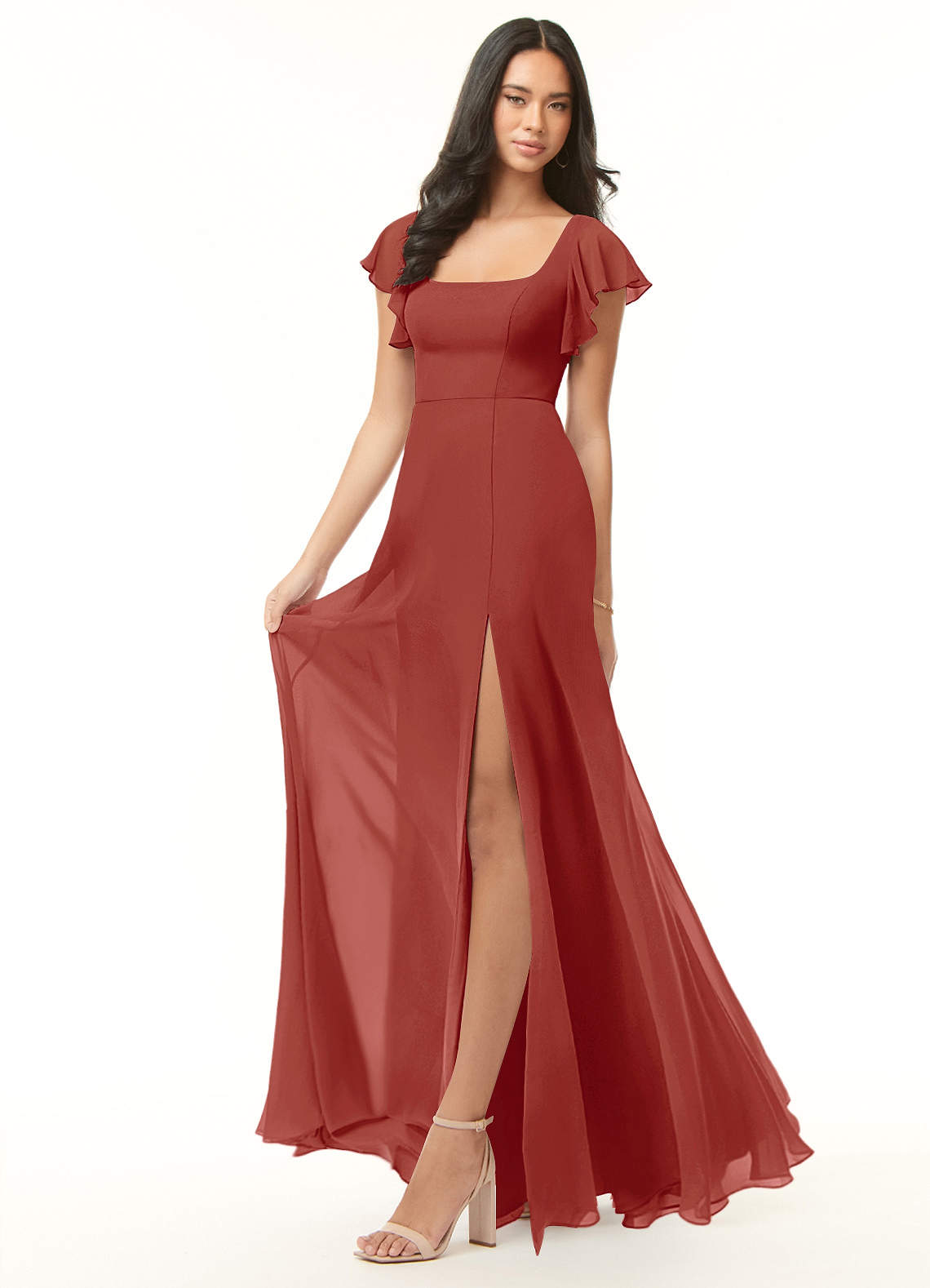 Bondi is our gorgeous bridesmaid dress cut from chiffon. She features a square neckline with flutter sleeves and a self tie scoop back. The look is complete with an A-line skirt paired with a leg slit.