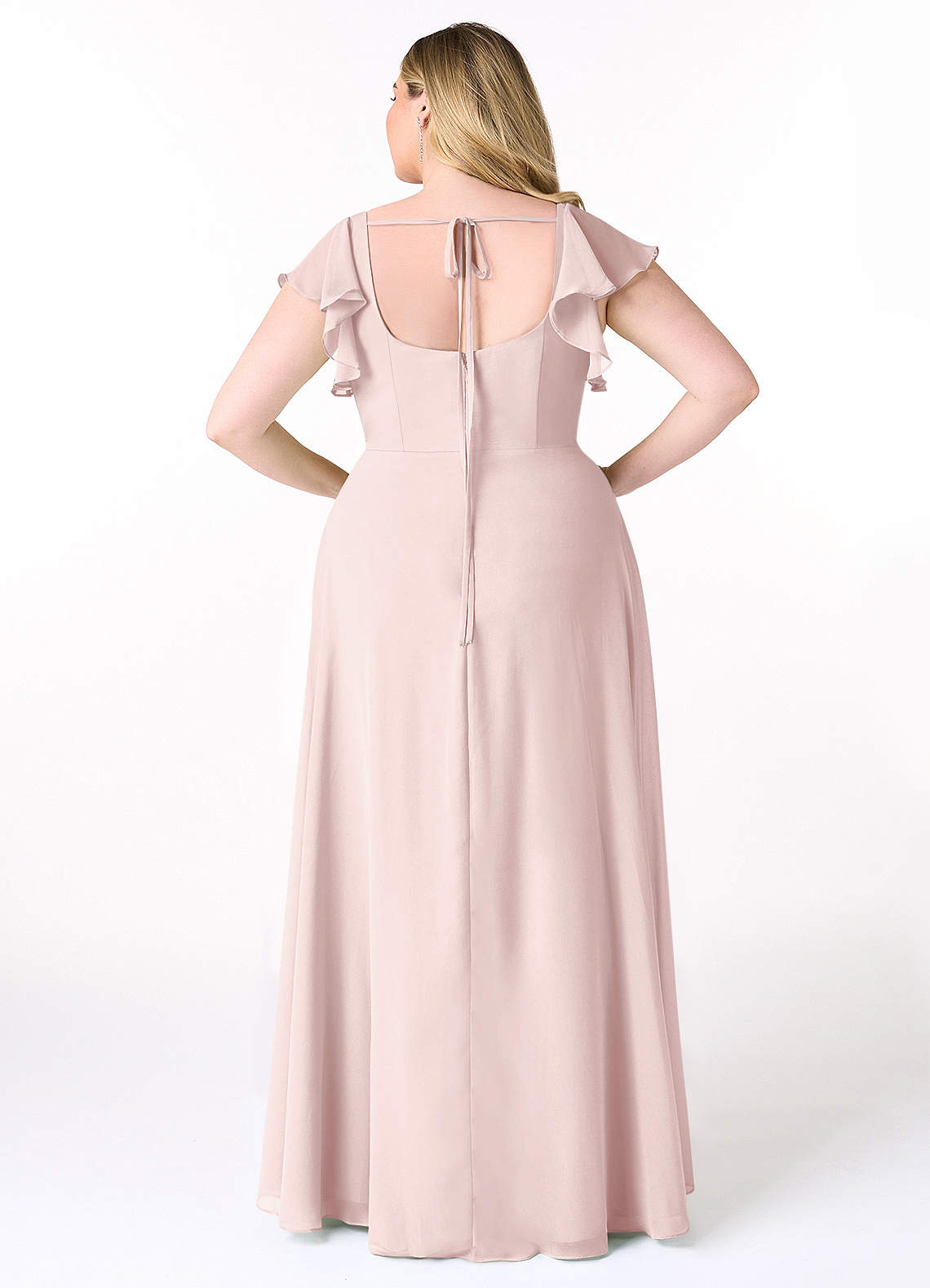 Bondi is our gorgeous bridesmaid dress cut from chiffon. She features a square neckline with flutter sleeves and a self tie scoop back. The look is complete with an A-line skirt paired with a leg slit.