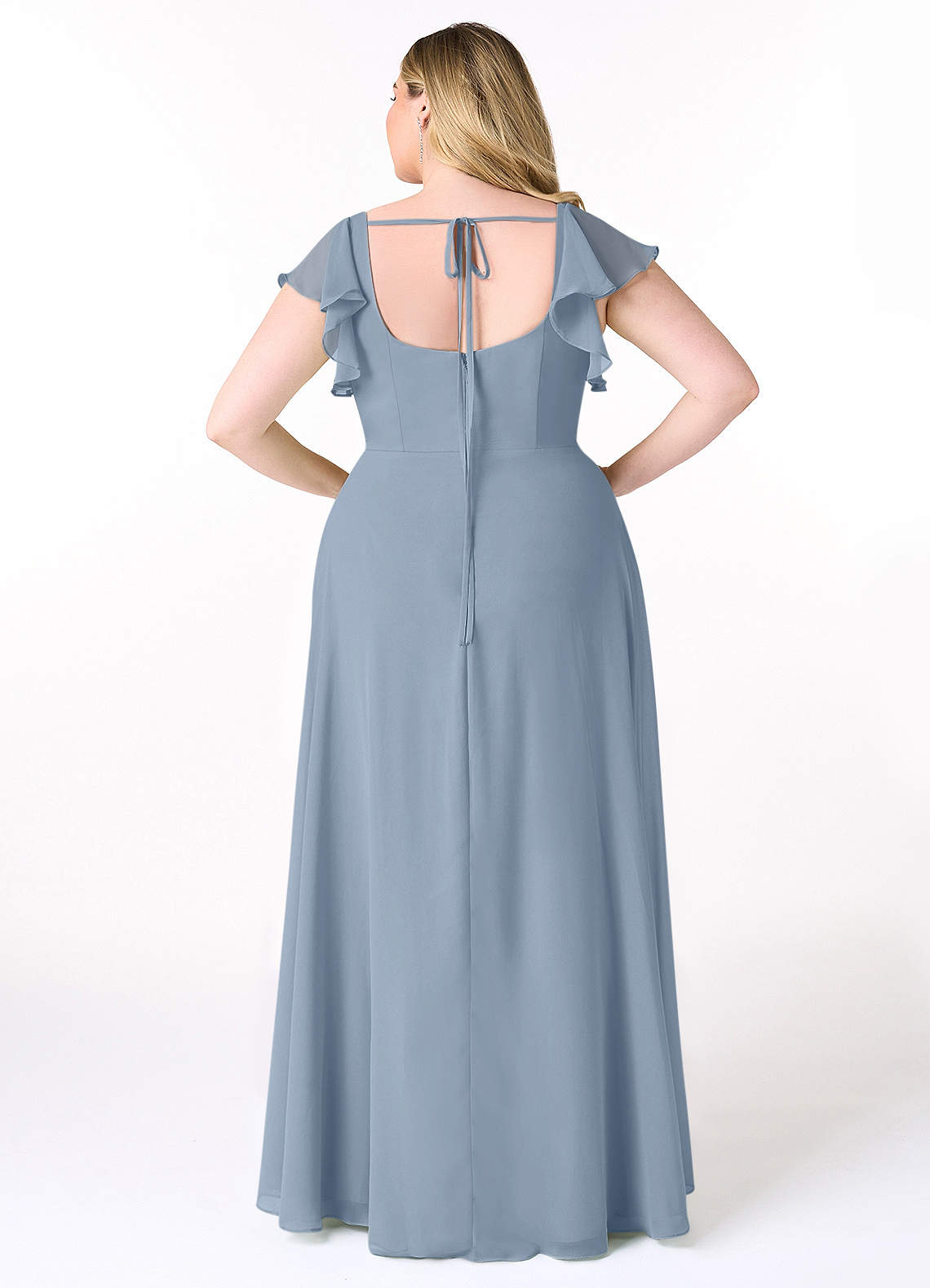 Bondi is our gorgeous bridesmaid dress cut from chiffon. She features a square neckline with flutter sleeves and a self tie scoop back. The look is complete with an A-line skirt paired with a leg slit.