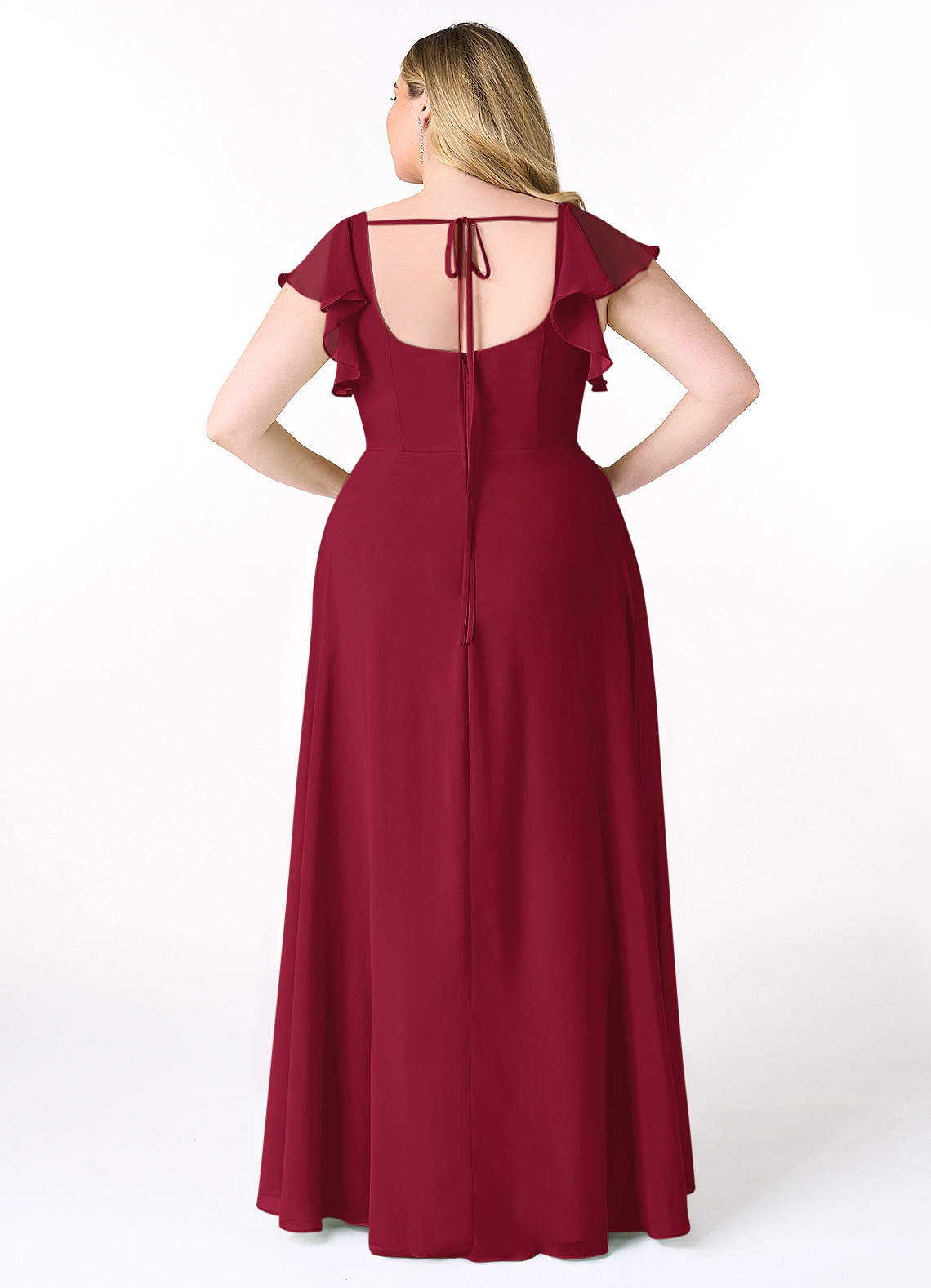 Bondi is our gorgeous bridesmaid dress cut from chiffon. She features a square neckline with flutter sleeves and a self tie scoop back. The look is complete with an A-line skirt paired with a leg slit.