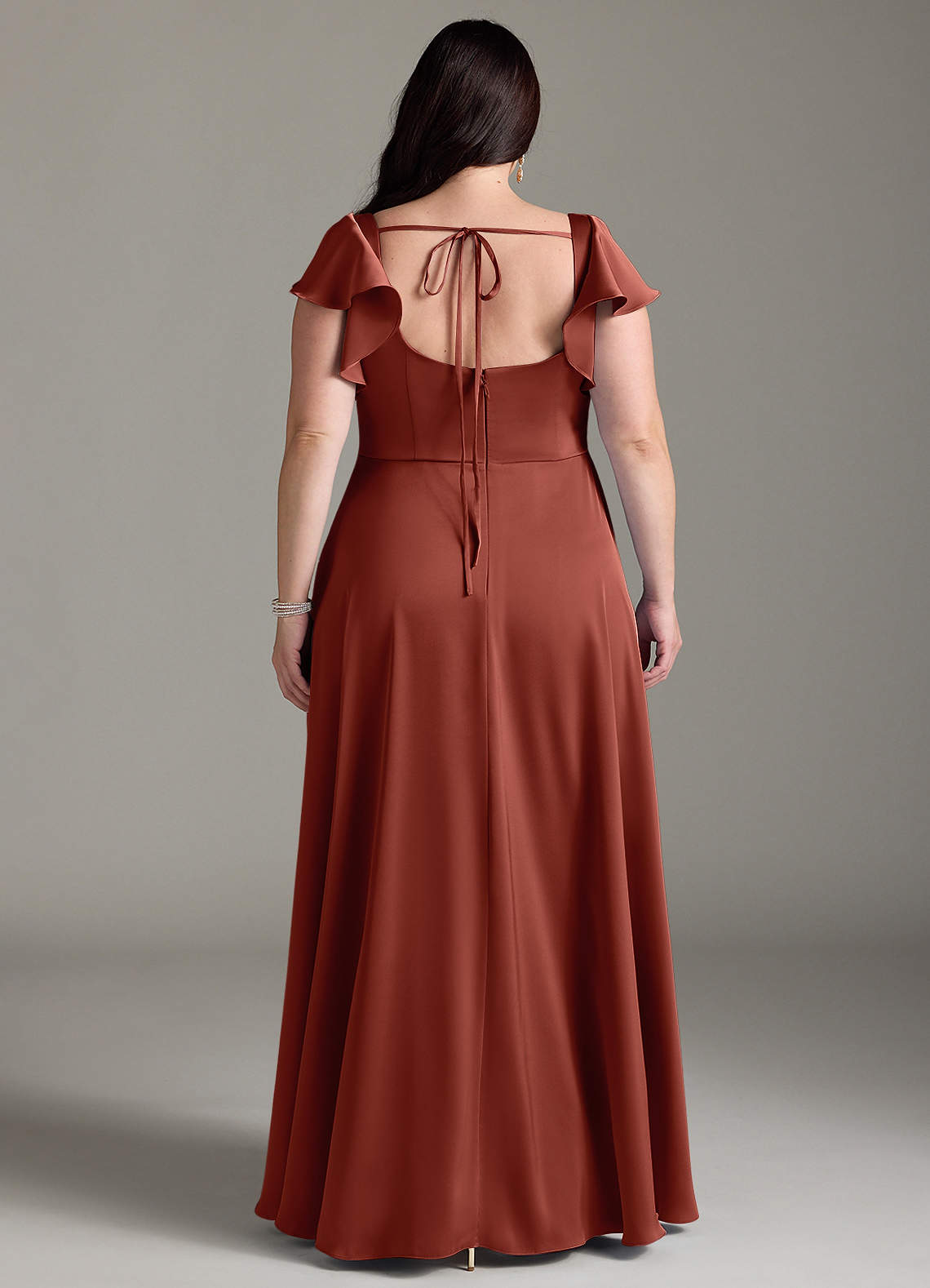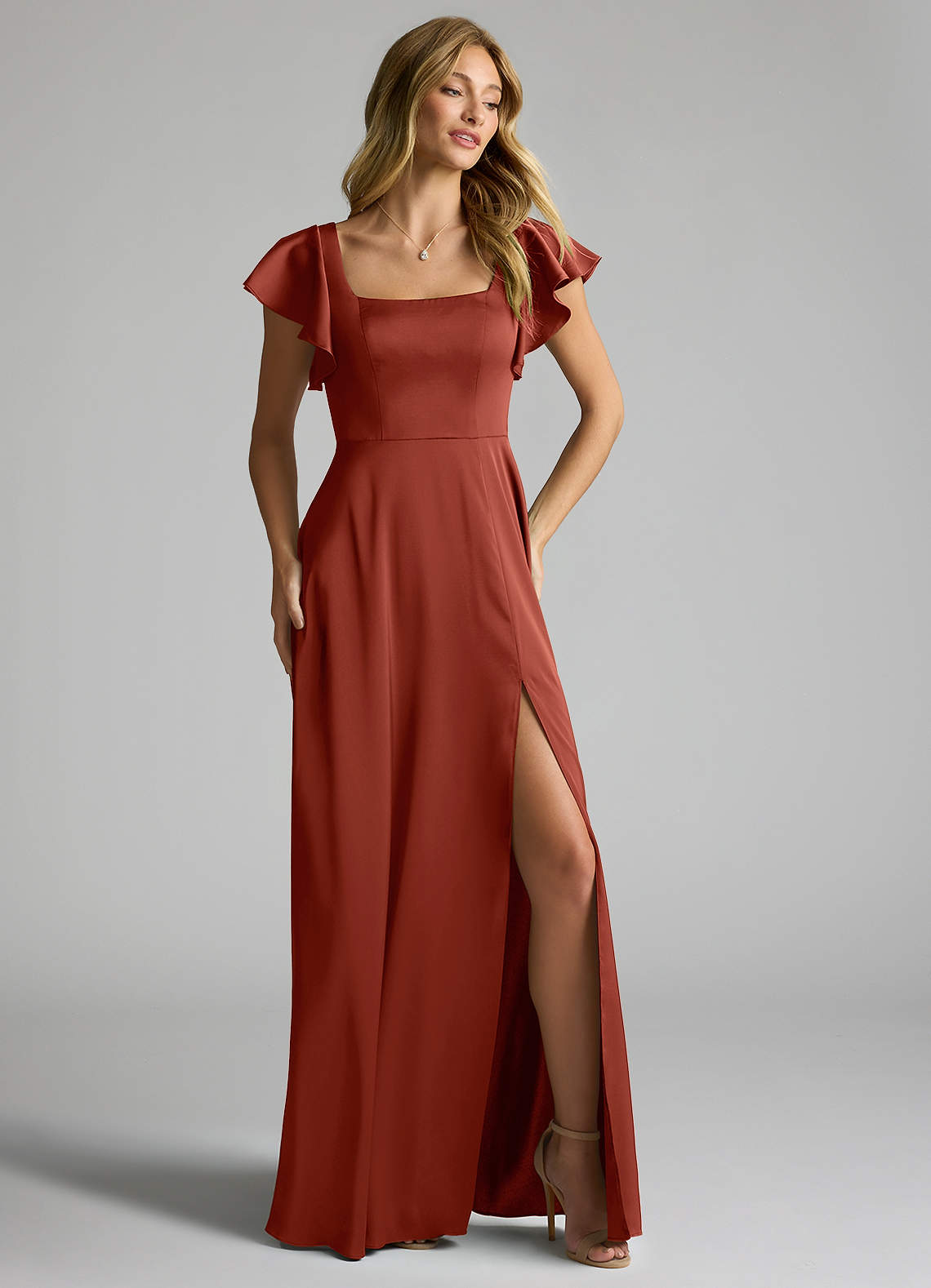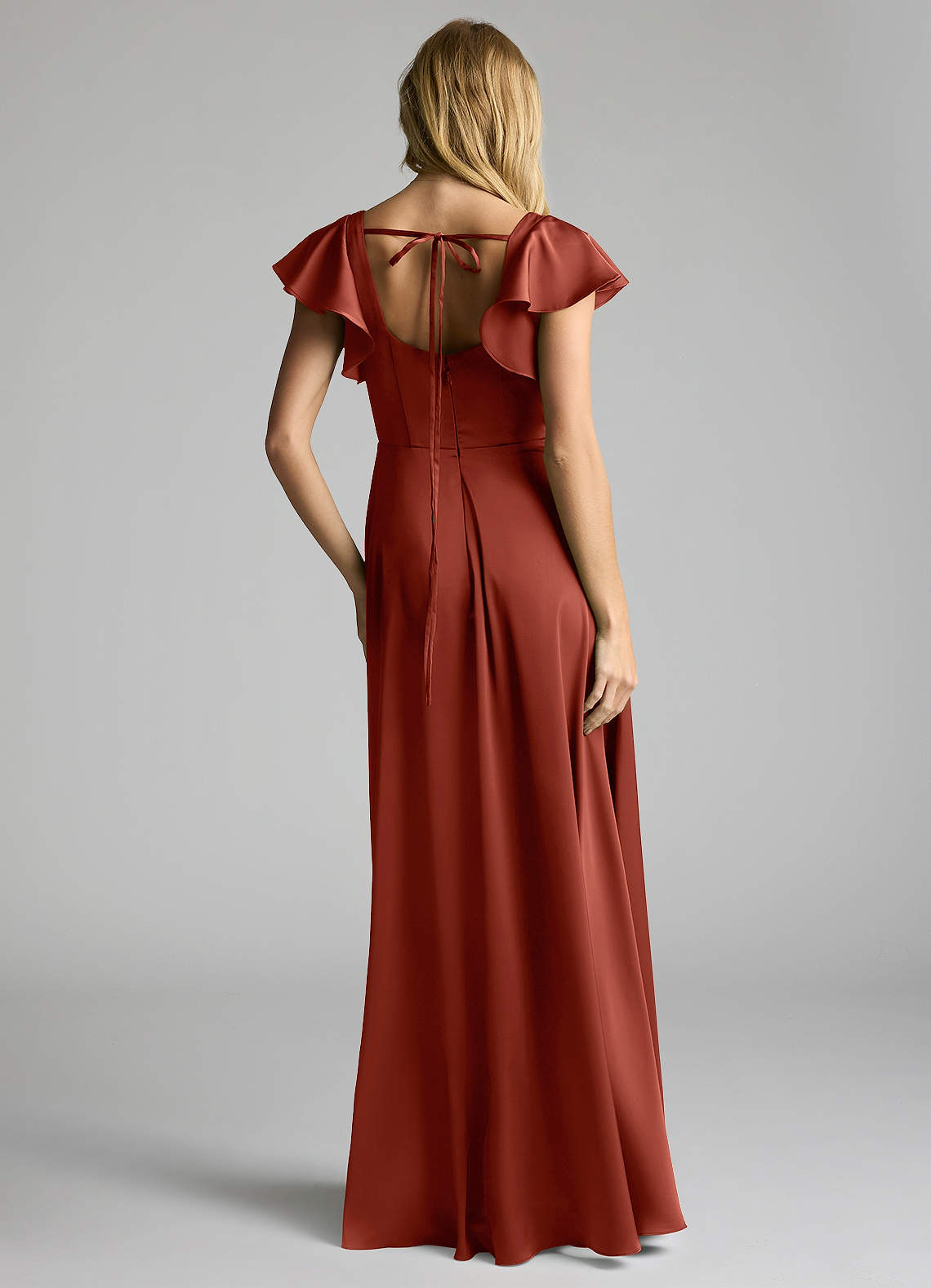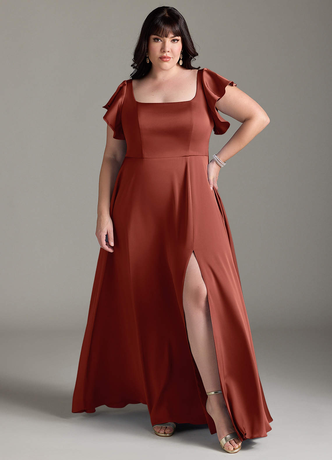 Bondi is our gorgeous bridesmaid dress cut from stretch satin. She features a square neckline with flutter sleeves and a self tie scoop back. The look is complete with an A-line skirt paired with a leg slit.