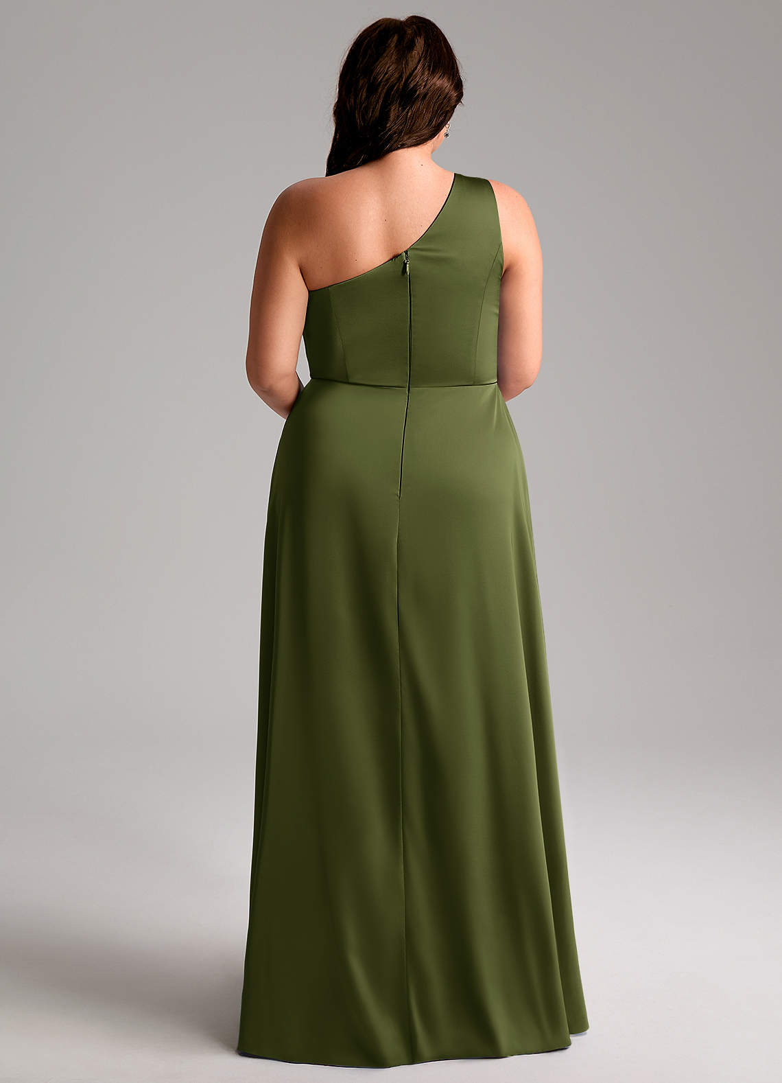 Look like a modern day Greek goddess wearing Brooke. This one-shoulder bridesmaid dress is made of a flattering stretch satin, giving your bridesmaids a look of modern elegance. Her bodice pleating and side waist knot accentuate the waistline, and a side leg slit adds an alluring touch to her classic A-line skirt.