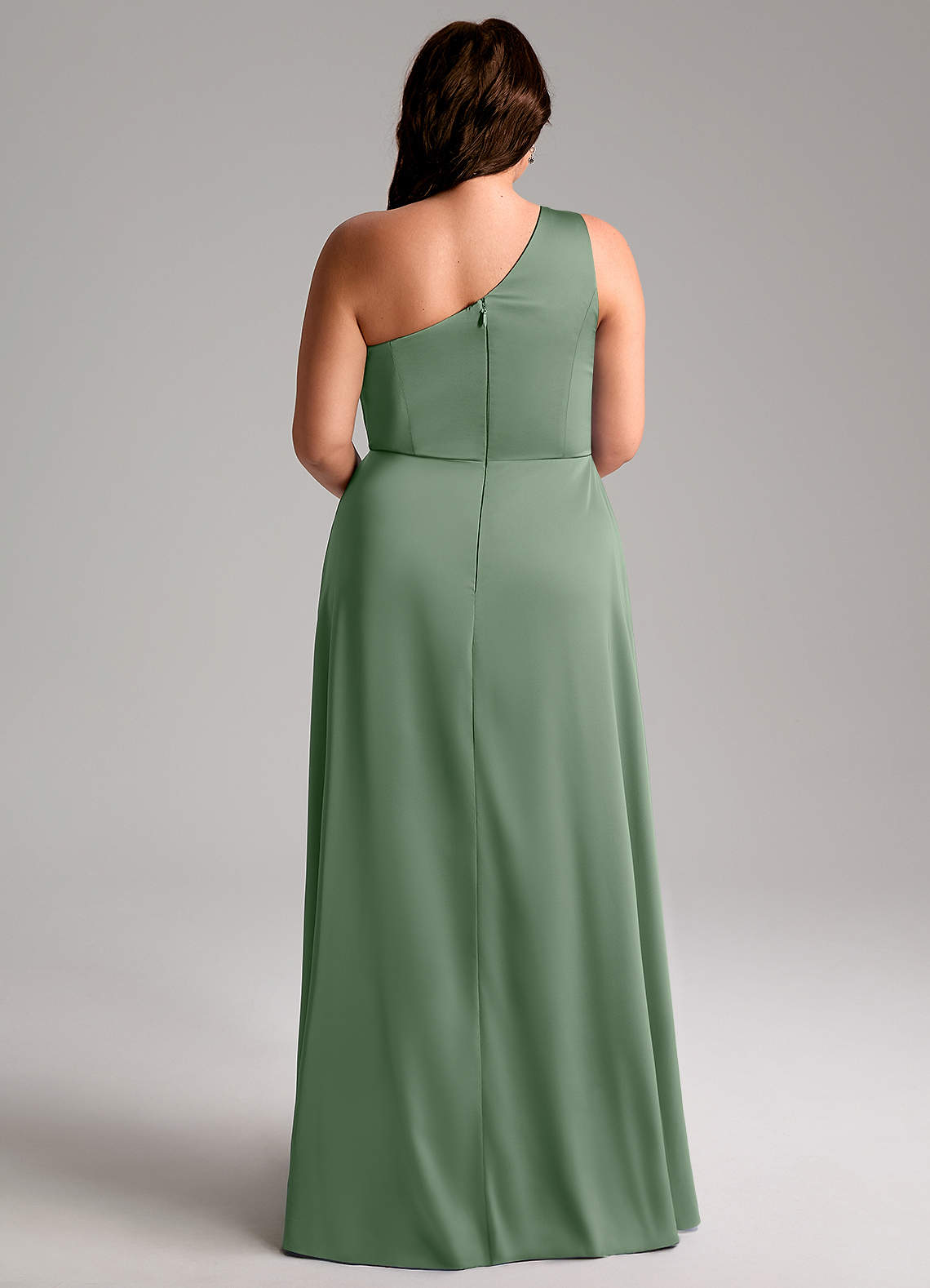 Look like a modern day Greek goddess wearing Brooke. This one-shoulder bridesmaid dress is made of a flattering stretch satin, giving your bridesmaids a look of modern elegance. Her bodice pleating and side waist knot accentuate the waistline, and a side leg slit adds an alluring touch to her classic A-line skirt.