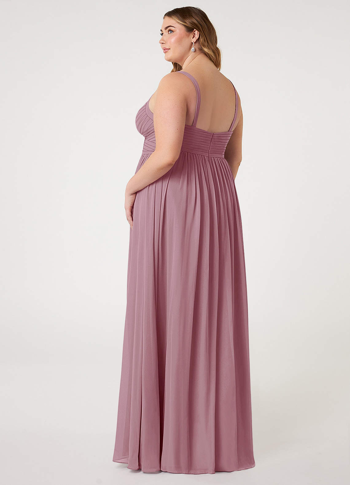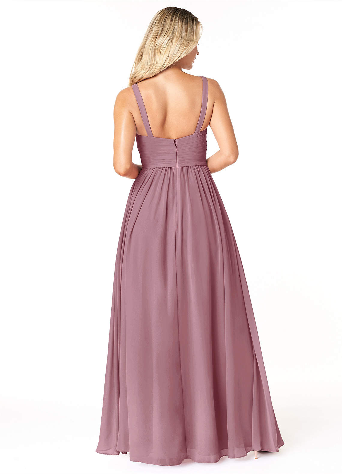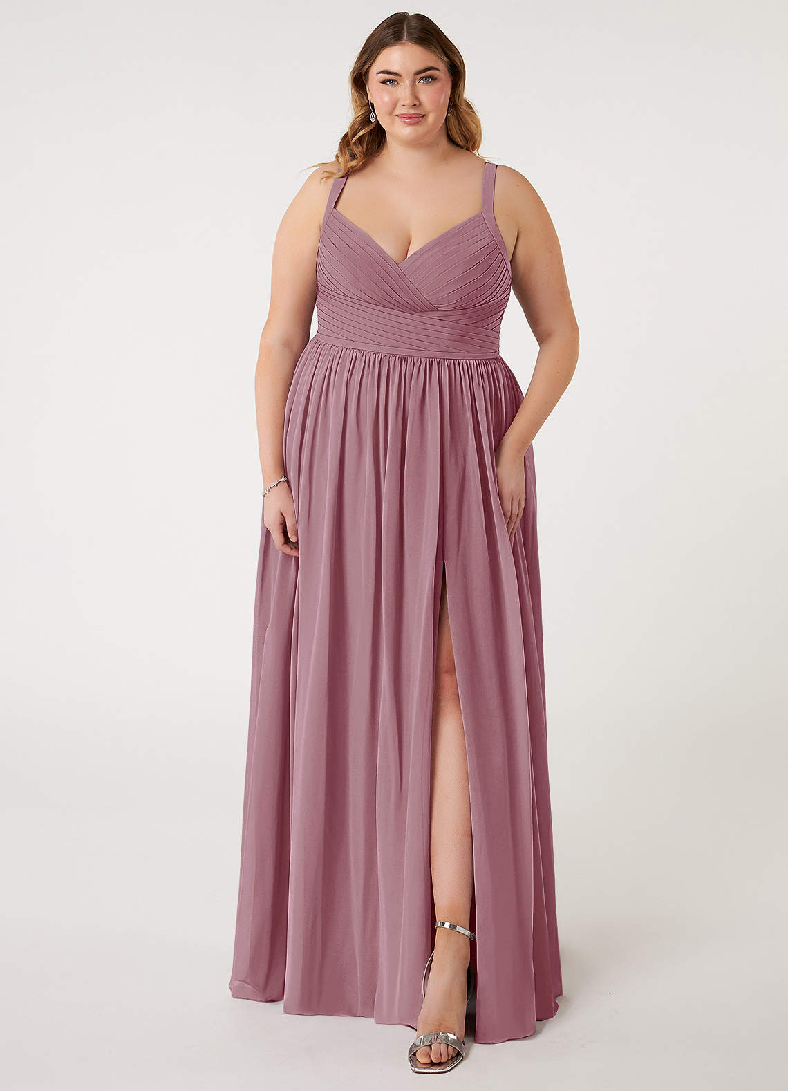 Chanel is a stunning bridesmaid dress cut from chiffon. This bridesmaid dress features a faux surplice bodice with a V-neckline and straps. The A-line skirt is gathered and comes with a leg slit.
