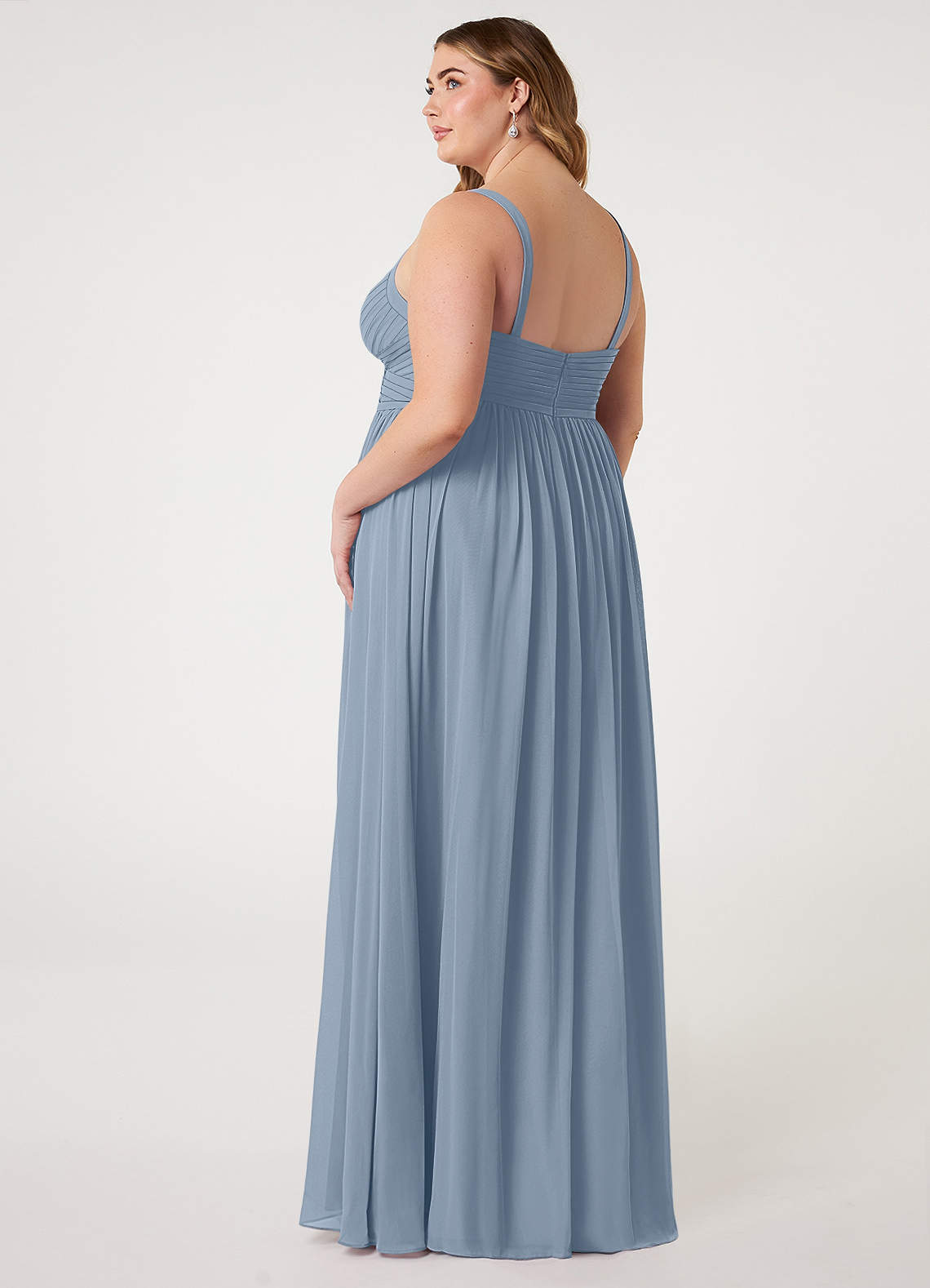Chanel is a stunning bridesmaid dress cut from chiffon. This bridesmaid dress features a faux surplice bodice with a V-neckline and straps. The A-line skirt is gathered and comes with a leg slit.
