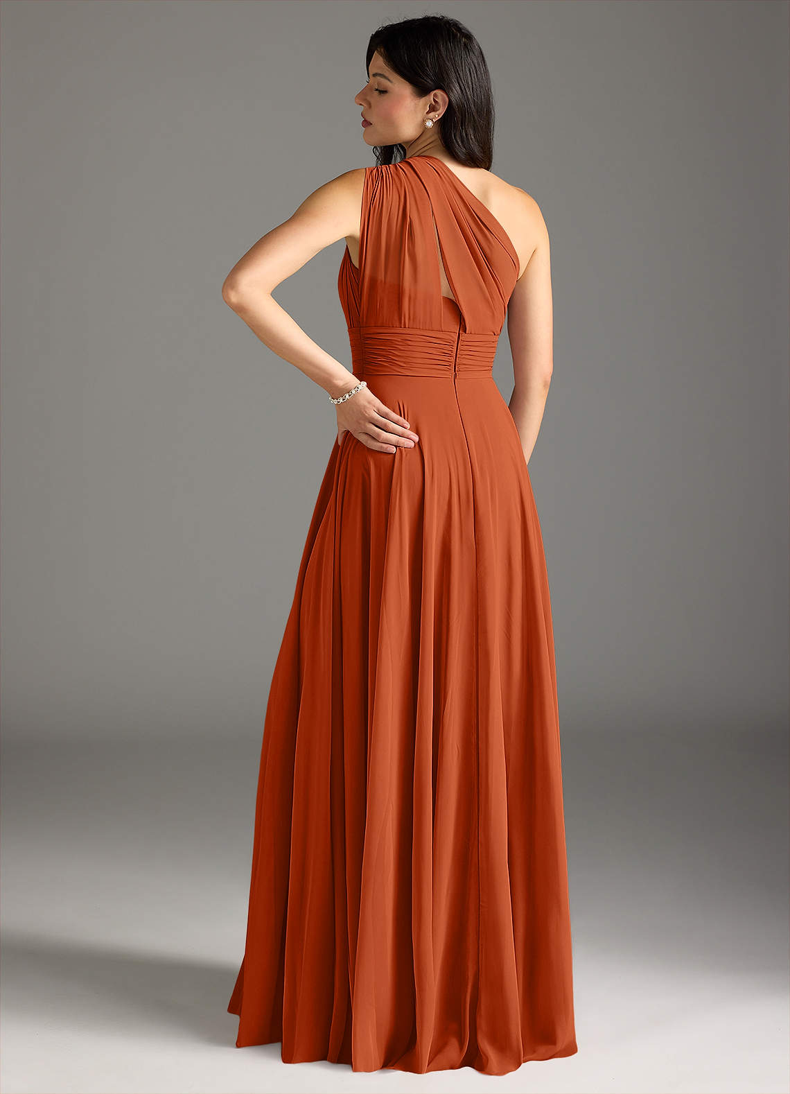 Charlize will make you feel like a modern Grecian goddess! The asymmetrical bridesmaid dress features delicately pleated panels and a twisted knot shoulder detail. The structed bodice is beautifully balanced with a softly gathered A-line skirt to flatter all shapes.