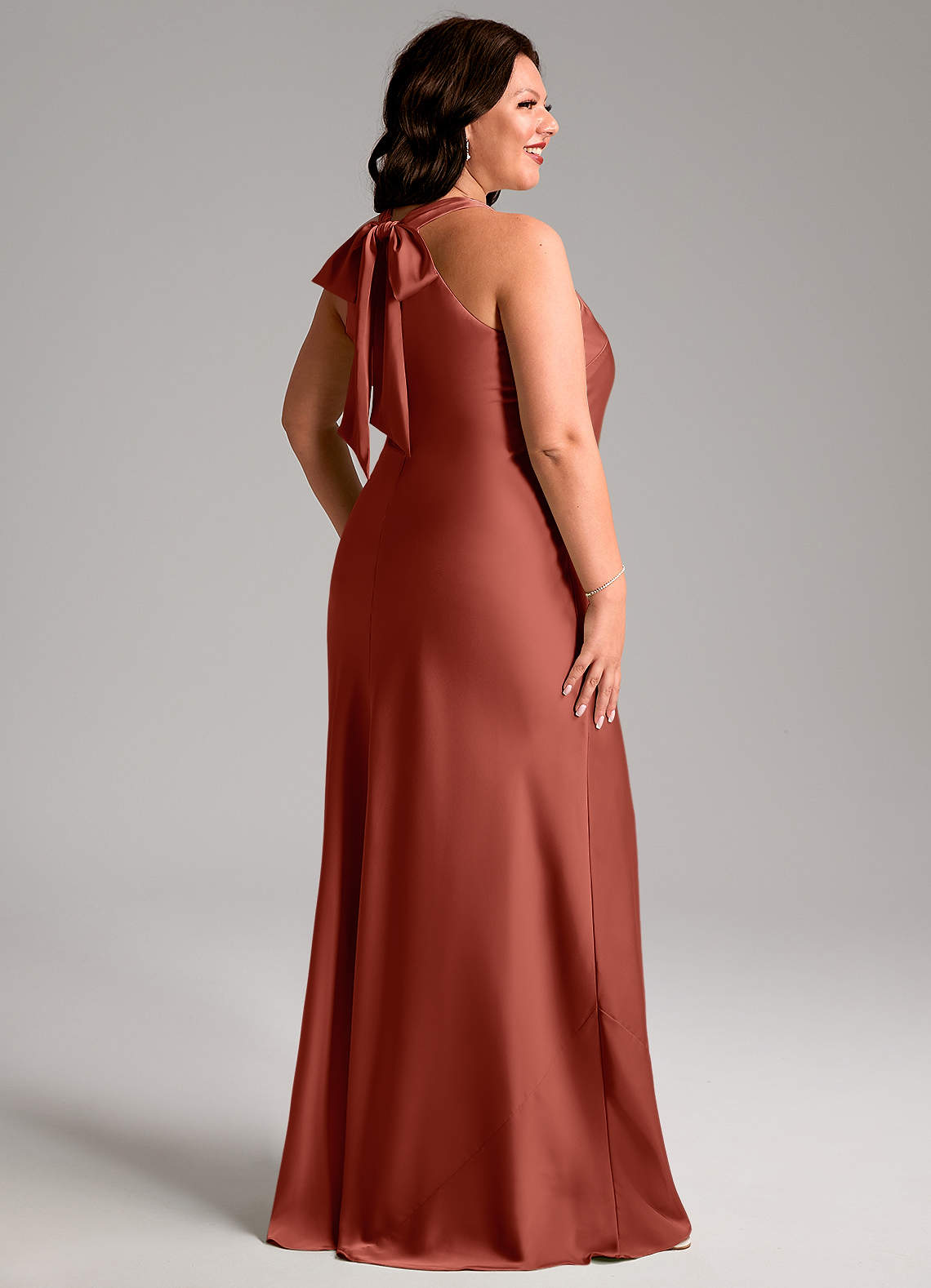 Doretta is the epitome of sleek sophistication, with a form-fitting mermaid shape in luminous stretch satin that hugs the curves and flows gracefully to the floor. The dress is enhanced by an elegant overlapping halter neckline, finished with a self-tie bow and a striking keyhole back detail.
