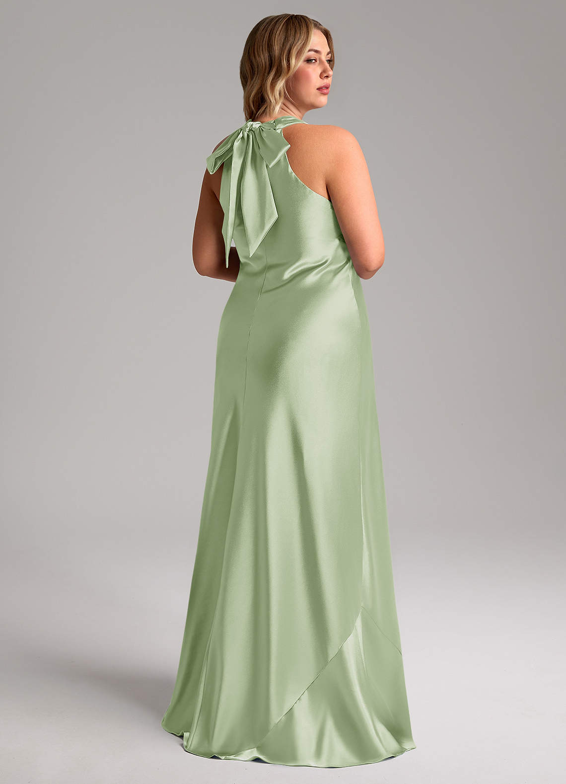 Doretta is the epitome of sleek sophistication, with a form-fitting mermaid shape in luminous metallic satin that hugs the curves and flows gracefully to the floor. The dress is enhanced by an elegant overlapping halter neckline, finished with a self-tie bow and a striking keyhole back detail.
