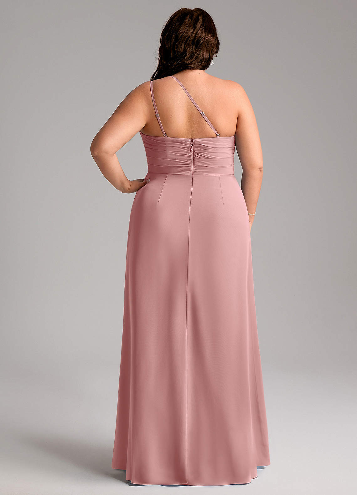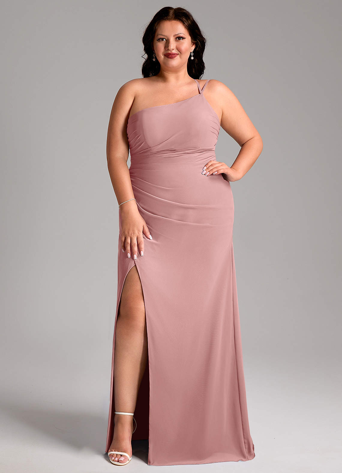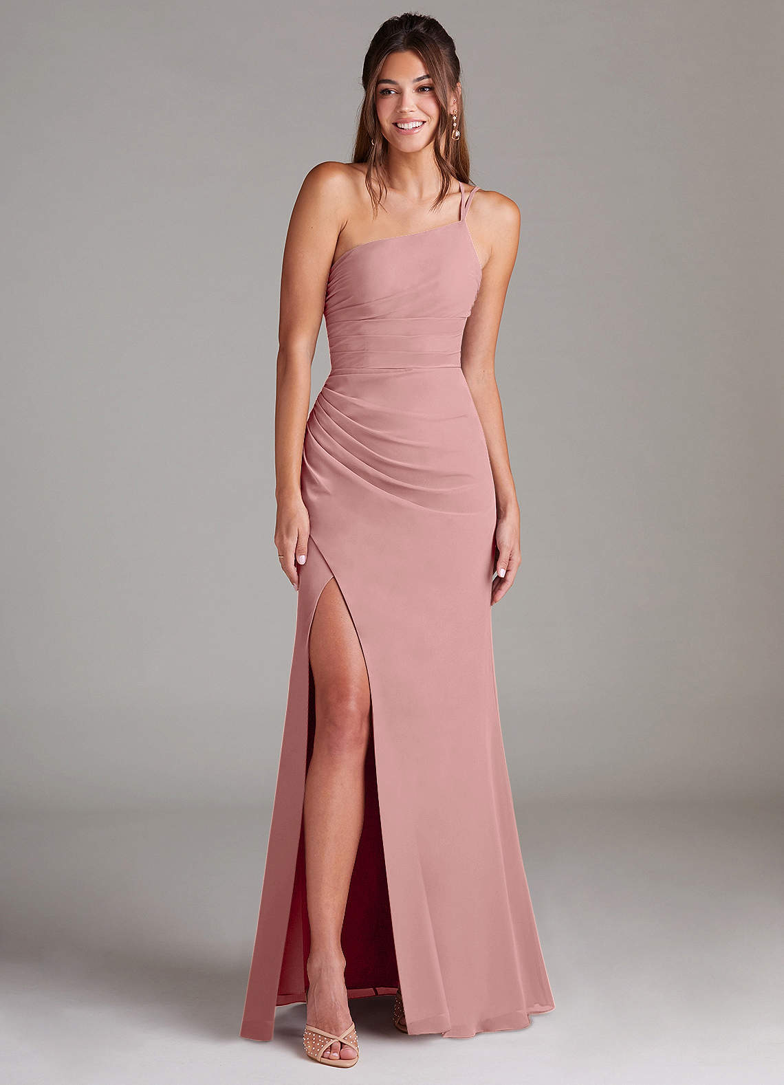 Stun the bridal party in our chiffon bridesmaid dress, Eren. Featuring an asymmetrical neckline, this bridesmaid dress is a one-shoulder style with a double strap detail. Pleating begins at the bodice and runs down onto the sheath skirt silhouette. Her draped pleated skirt overlaps and creates a dramatic leg slit when walking.