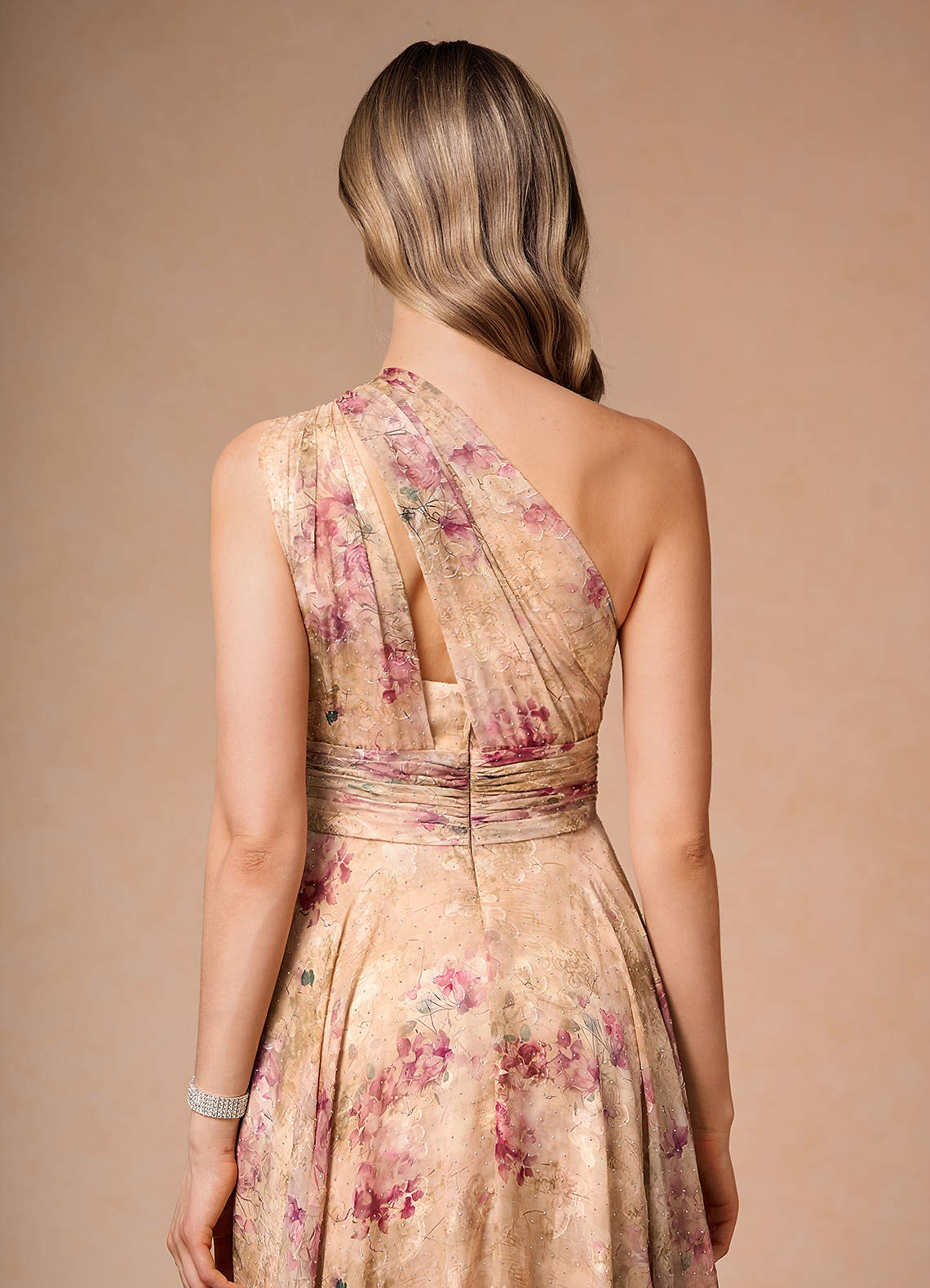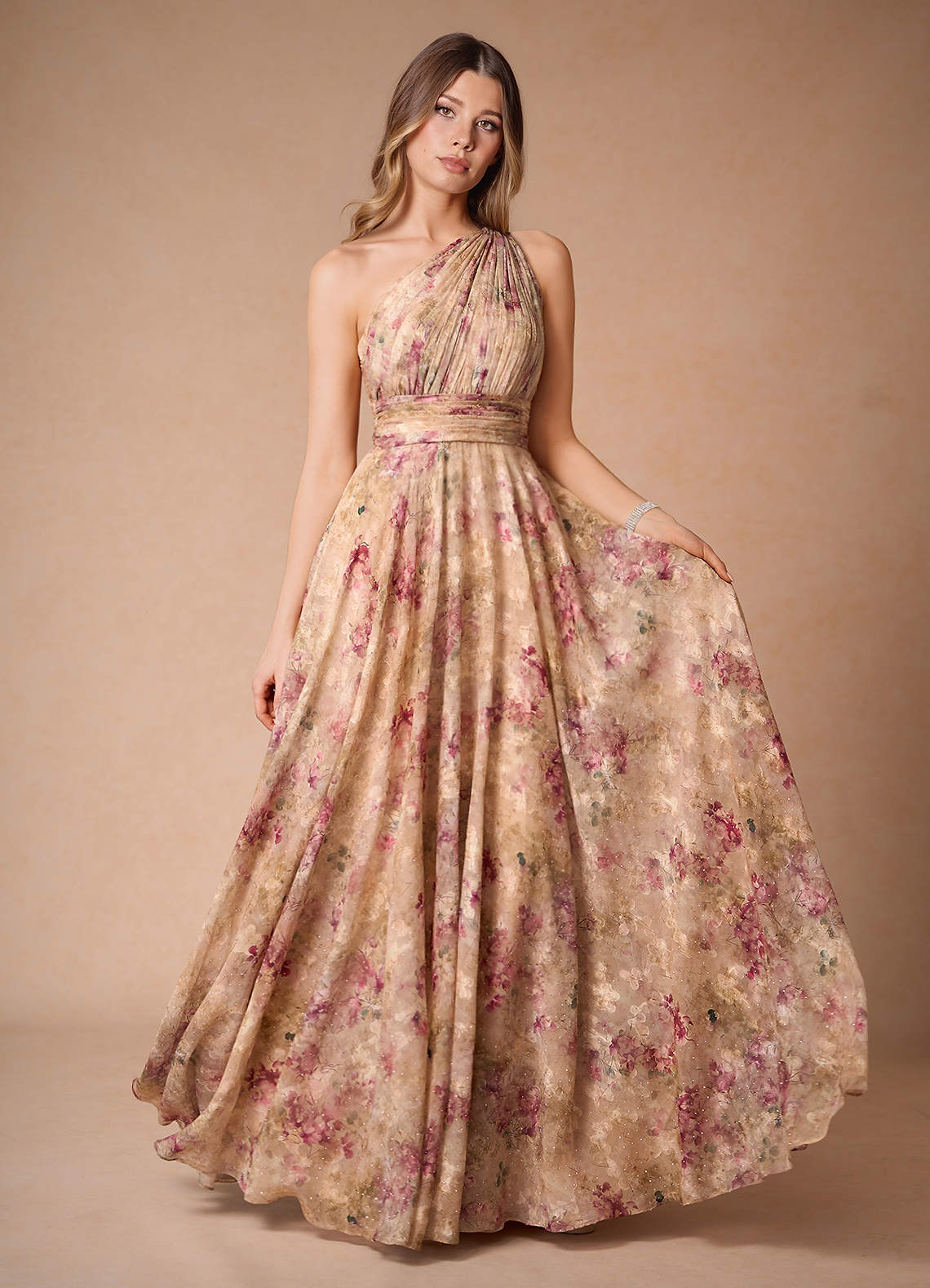 Hestia will make you feel like a modern Grecian goddess! The asymmetrical bridesmaid dress features delicately pleated panels and a twisted knot shoulder detail. Crafted from printed crystal jacquard.The structed bodice is beautifully balanced with a softly gathered A-line skirt to flatter all shapes.