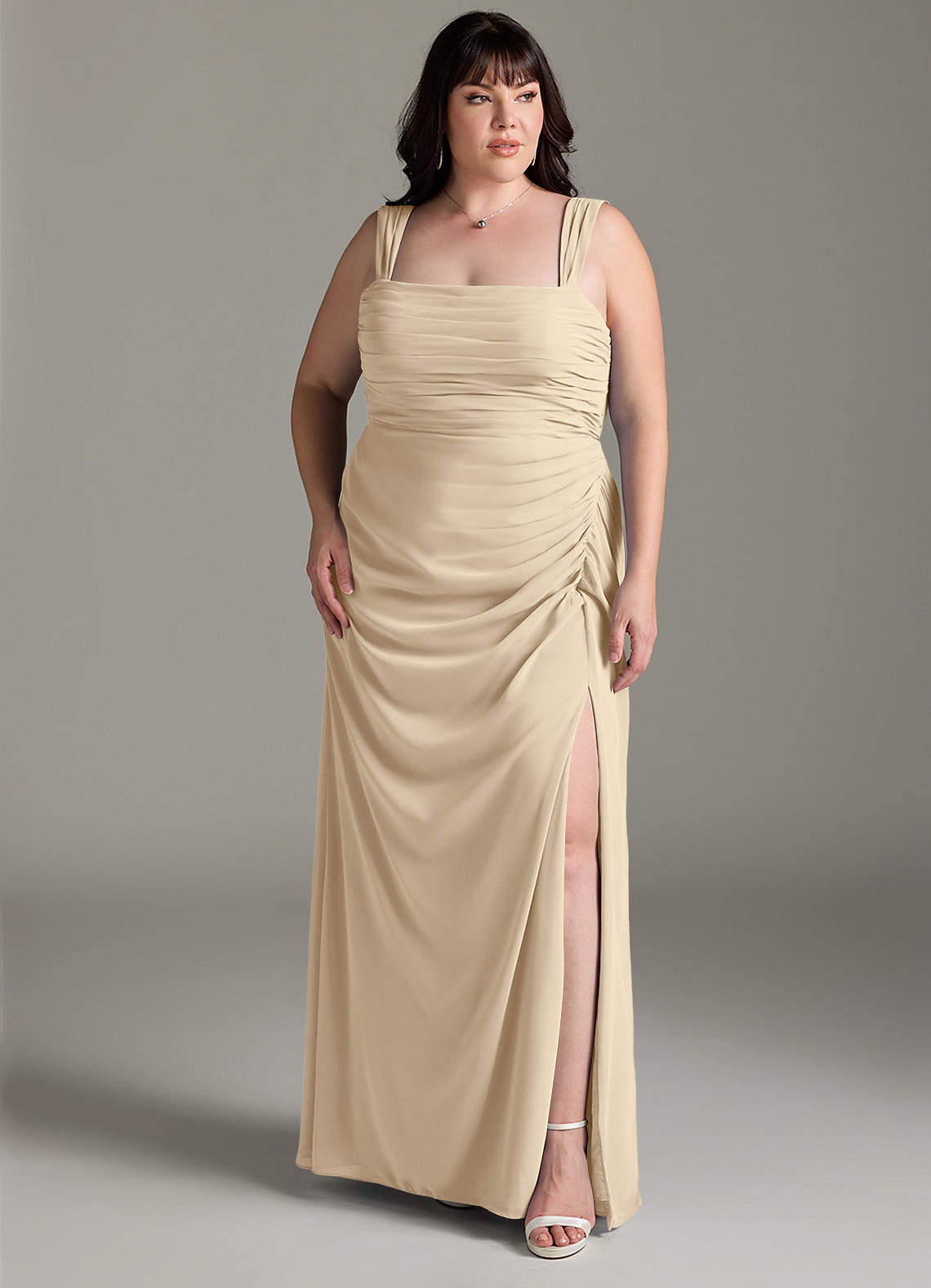 Be there for your best friend's special day in Jesaphine, our chic chiffon bridesmaid dress. She features a straight neckline with a ruched body, ruched shoulder straps, a fashionable keyhole bow tie back, and a leg slit to dance the night away.