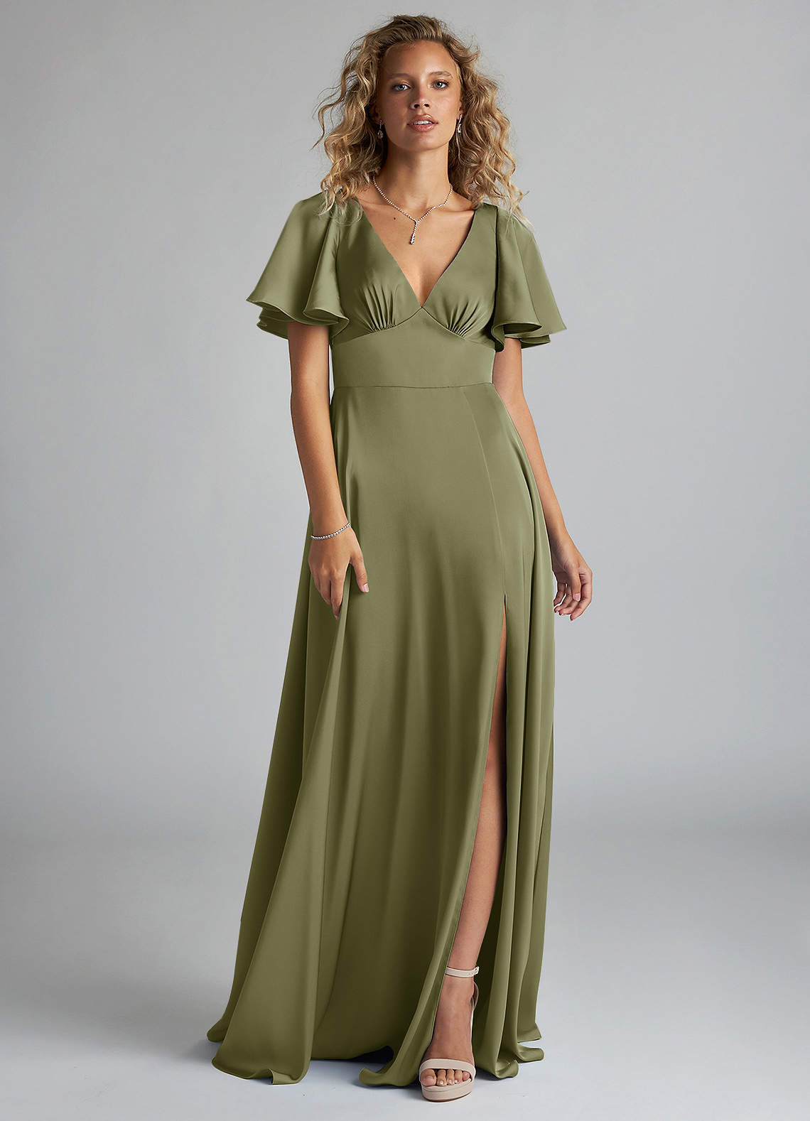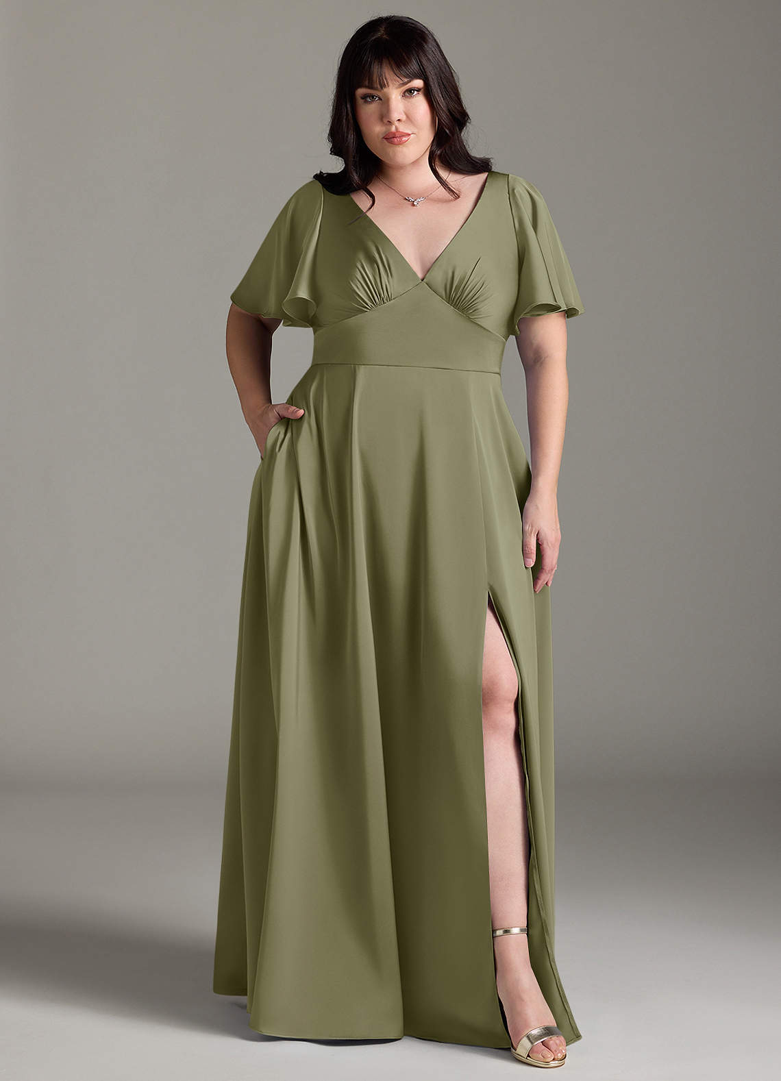 Kimber is a refreshing, modern choice for your bridal party. Featuring a V-neck bodice with an accentuating under-bust seam, the silhouette is highlighted by a stunning butterfly sleeve design. Her back bodice has a tieable bow detail with a keyhole opening. Her floor length A-line skirt has a leg slit that provides comfort for walking. We have also added pockets!