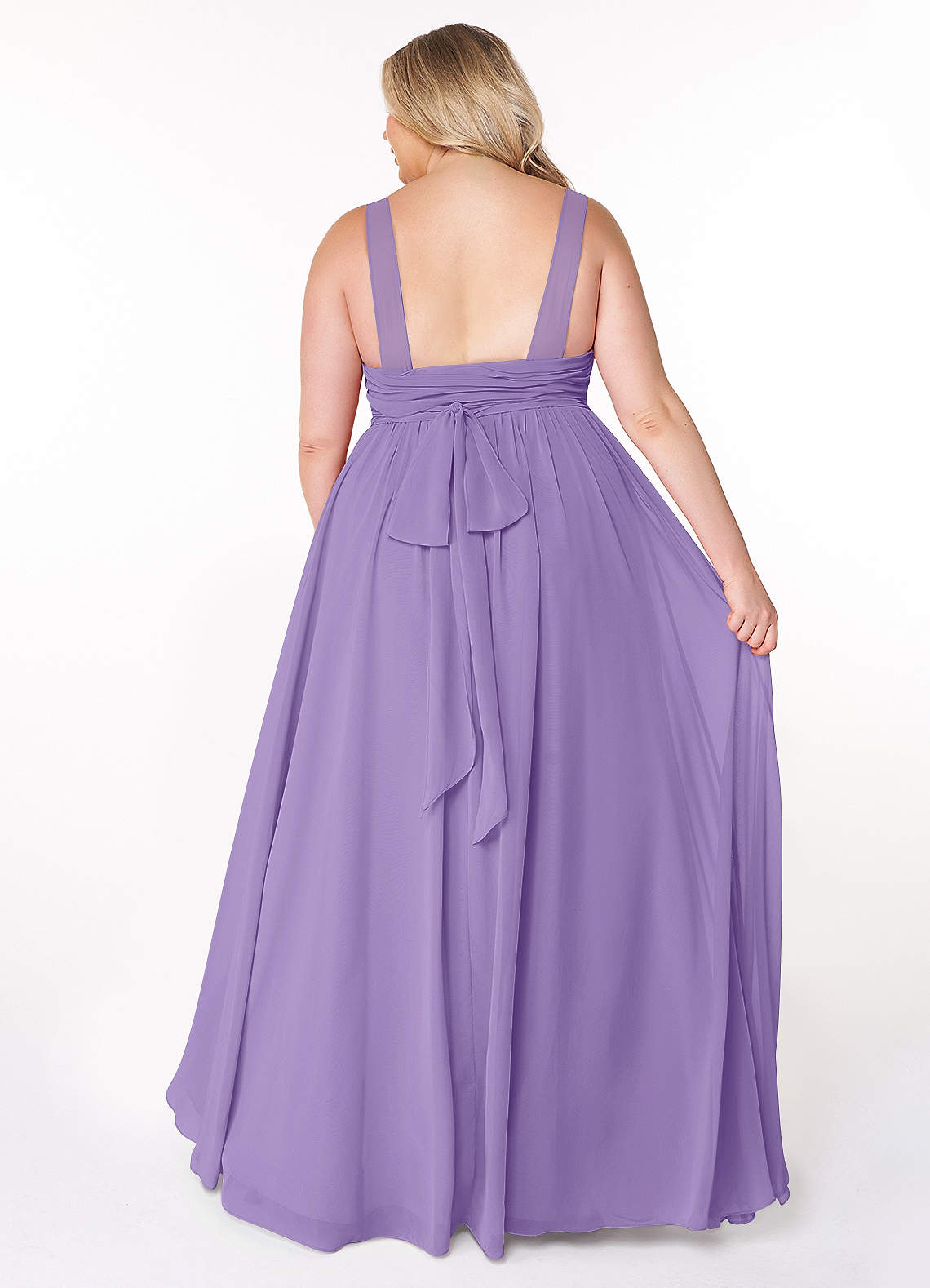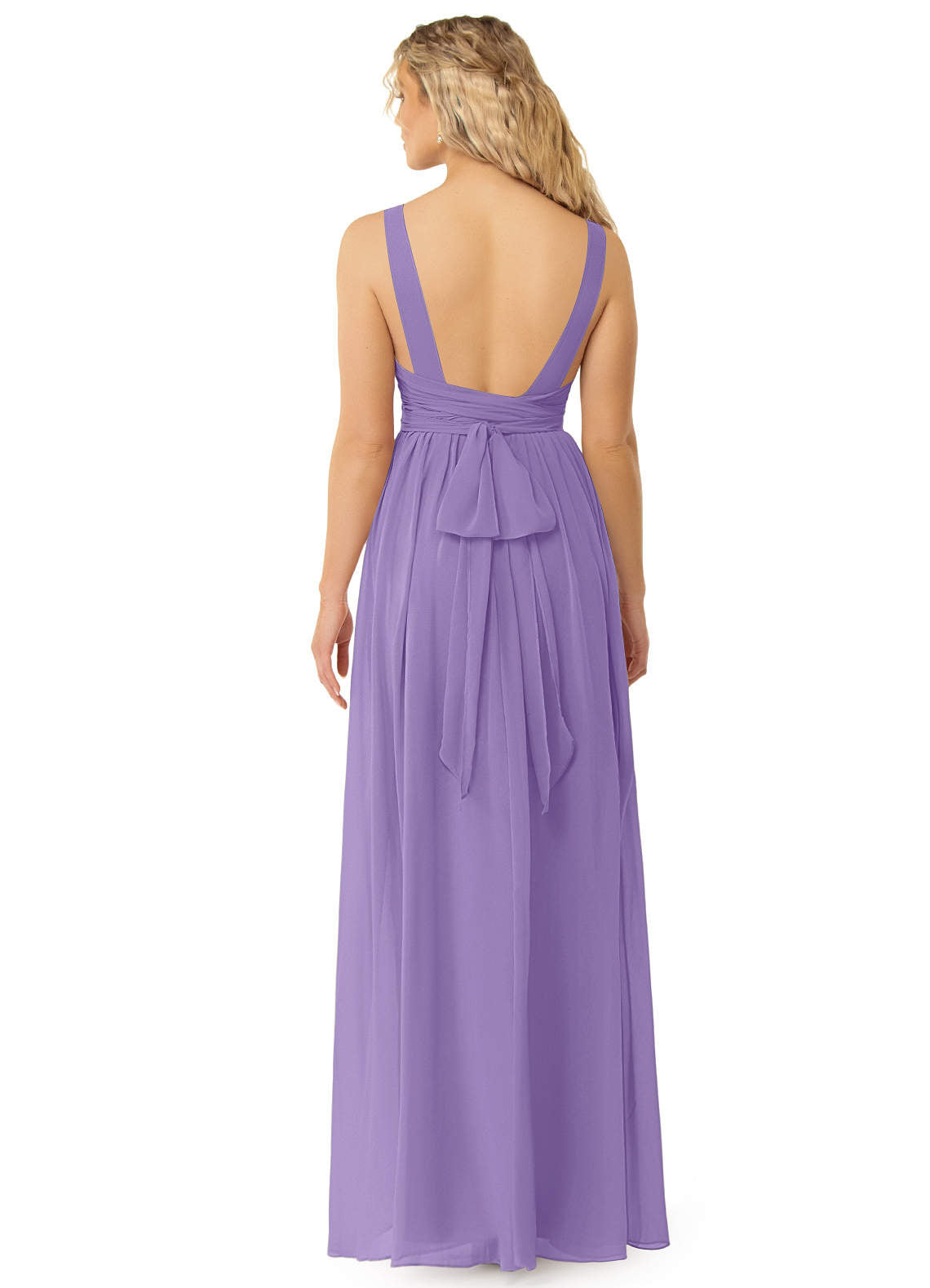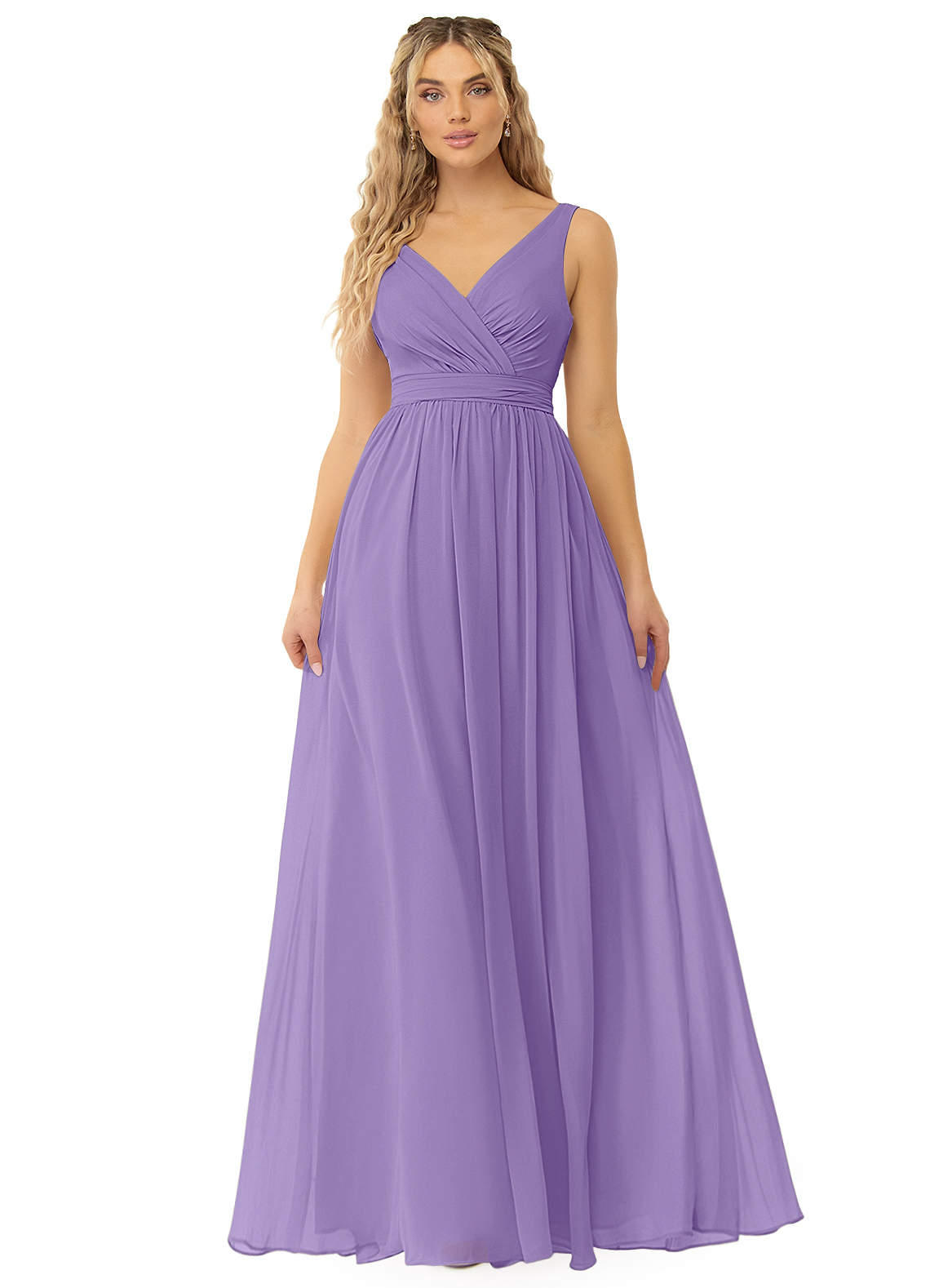 The attractive floor-length bridesmaid dress by Azazie has an A-line/princess cut in a gorgeous chiffon. This bridesmaid dress features a v-neck neckline and comes in a full-size range (A0-A30). A pleated detail at the front and back of the flowing skirt makes it perfect for the reception or a city hall wedding.