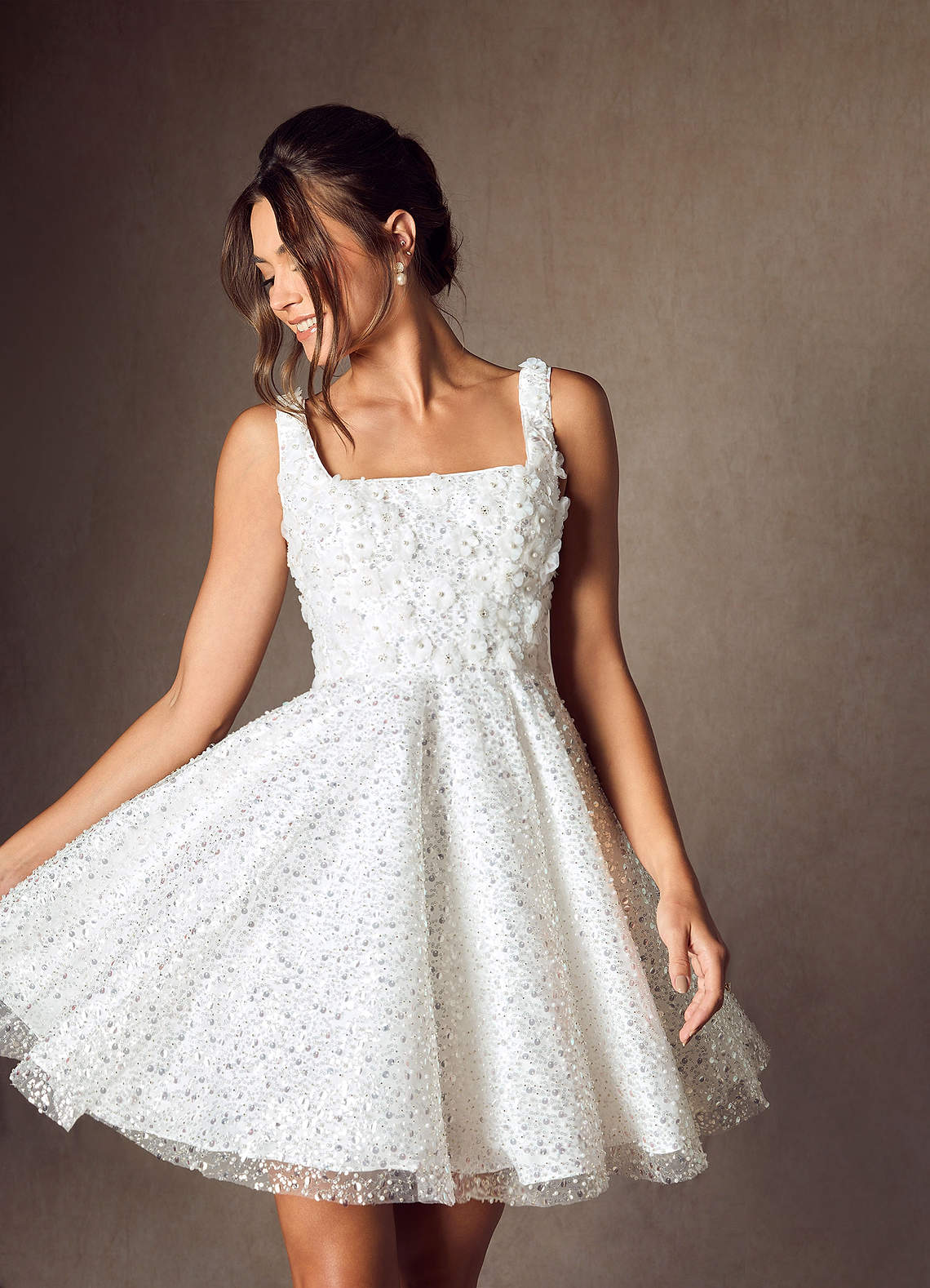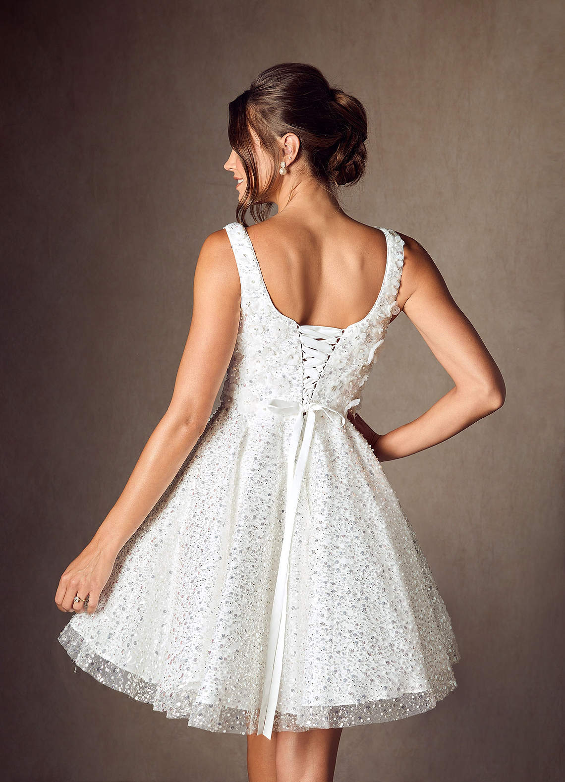 The Kristi dress is a playful lace and tulle style featuring 3D floral embellishments, a square neckline, wide shoulder straps, a self-tie lace-up back, and an A-line mini skirt with pockets. Kristi is the perfect bachelorette style or an elopement wedding dress.