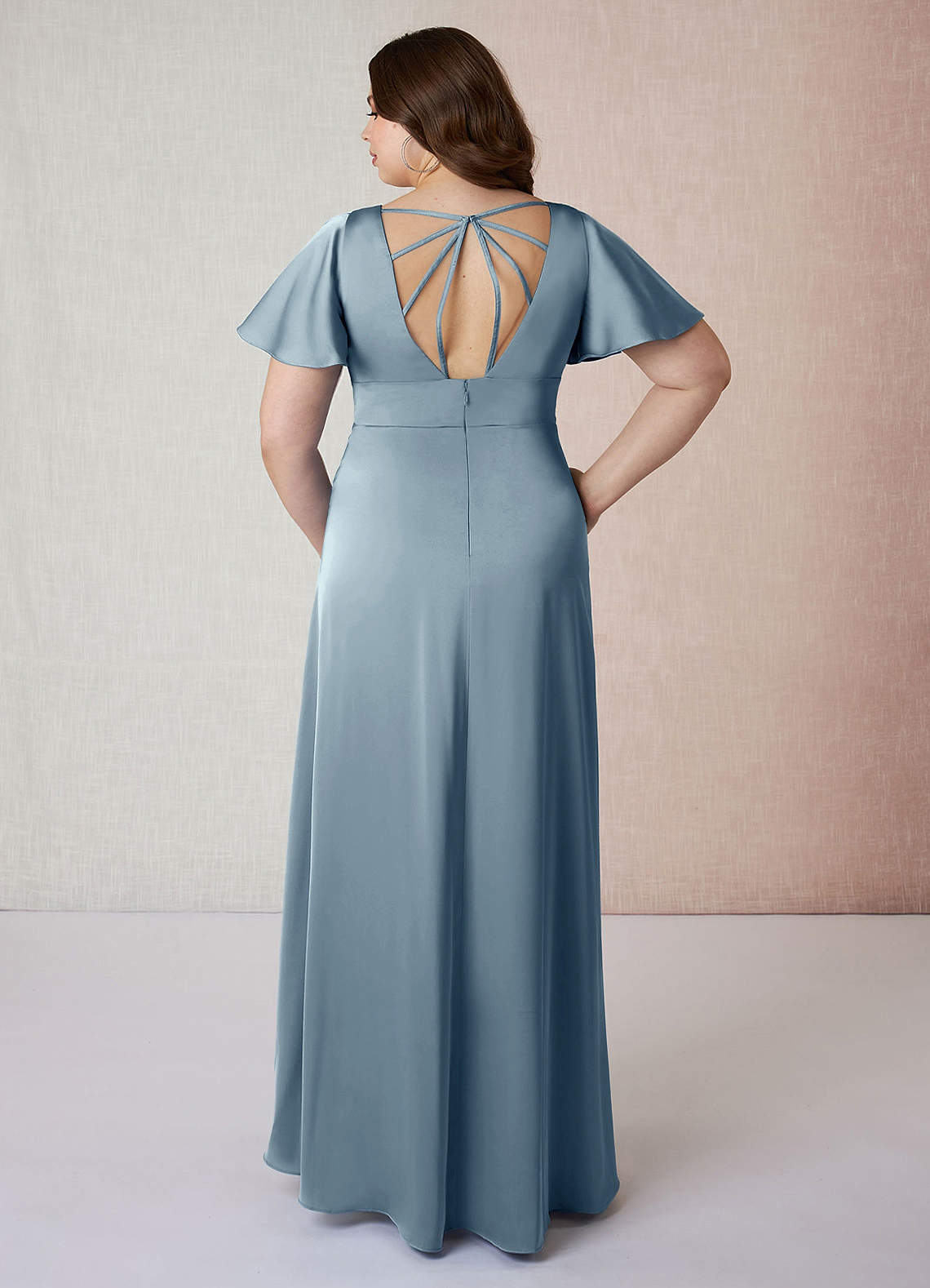 Let your girls have memorable moments wearing our stretch satin A-line gown, Lani. She has a clean V-neckline that sits atop an empire waistband. Her flutter sleeves compliment the strap detail on the partial illusion back. Her slim A-line bridesmaid dress flares beautifully with every step.