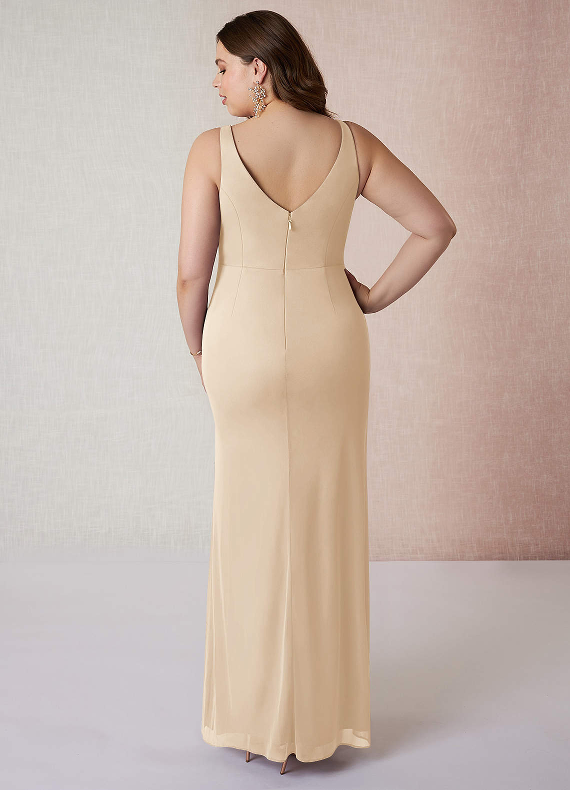 Leandra is our gorgeous bridesmaid dress cut from stretch mesh. She features a V-neckline with a pleated bodice. The look is complete with a mermaid skirt and leg slit.