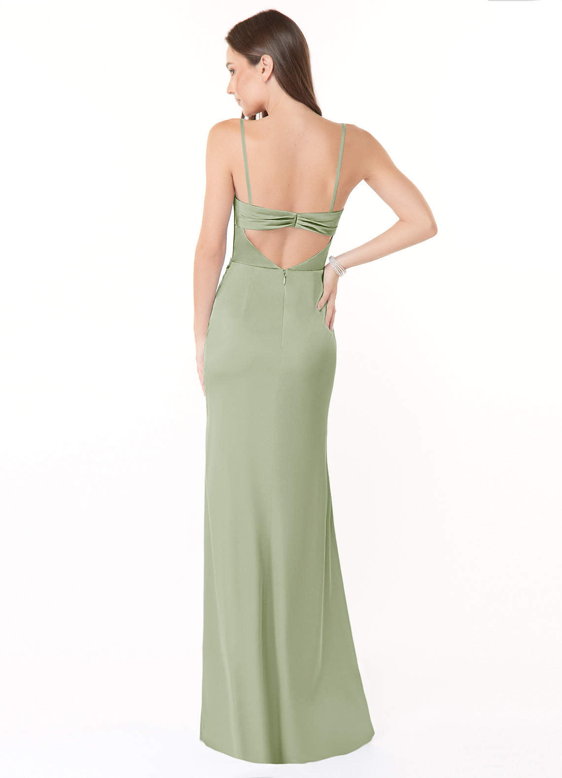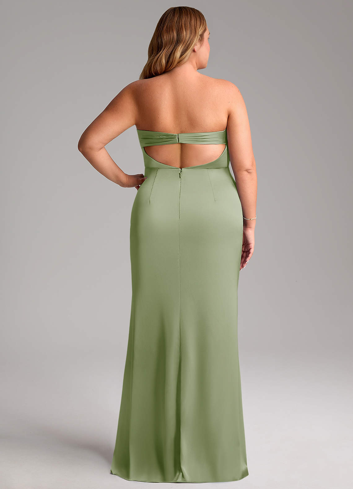 Let your bridesmaids wear our stretch satin mermaid dress, Leonis. Her strapless cowl neckline offers removable straps and a bandeau back over a keyhole detail. The skirt has beautiful pleating details over a front leg slit that opens beautifully with every step.