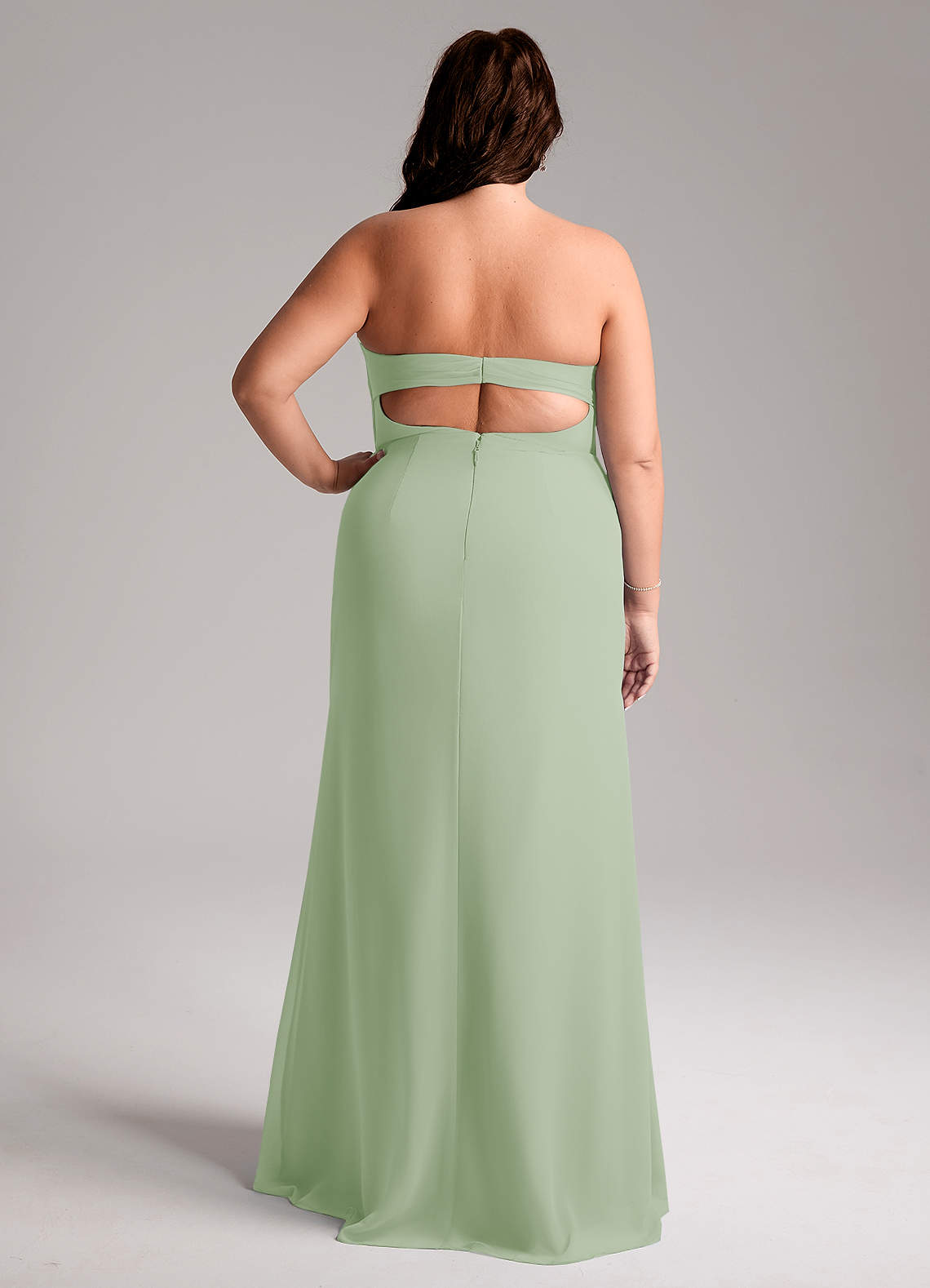 Let your bridesmaids wear our chiffon mermaid dress, Leonis. Her strapless cowl neckline offers removable straps and a bandeau back over a keyhole detail. The skirt has beautiful pleating details over a front leg slit that opens beautifully with every step.