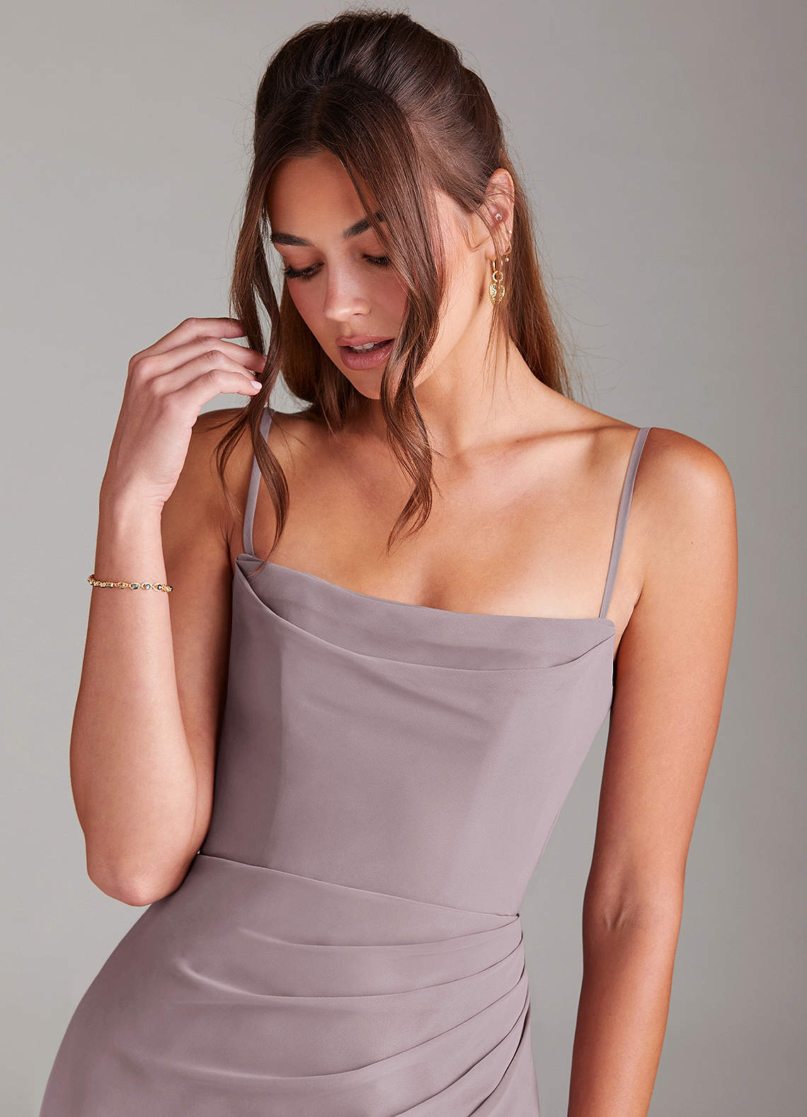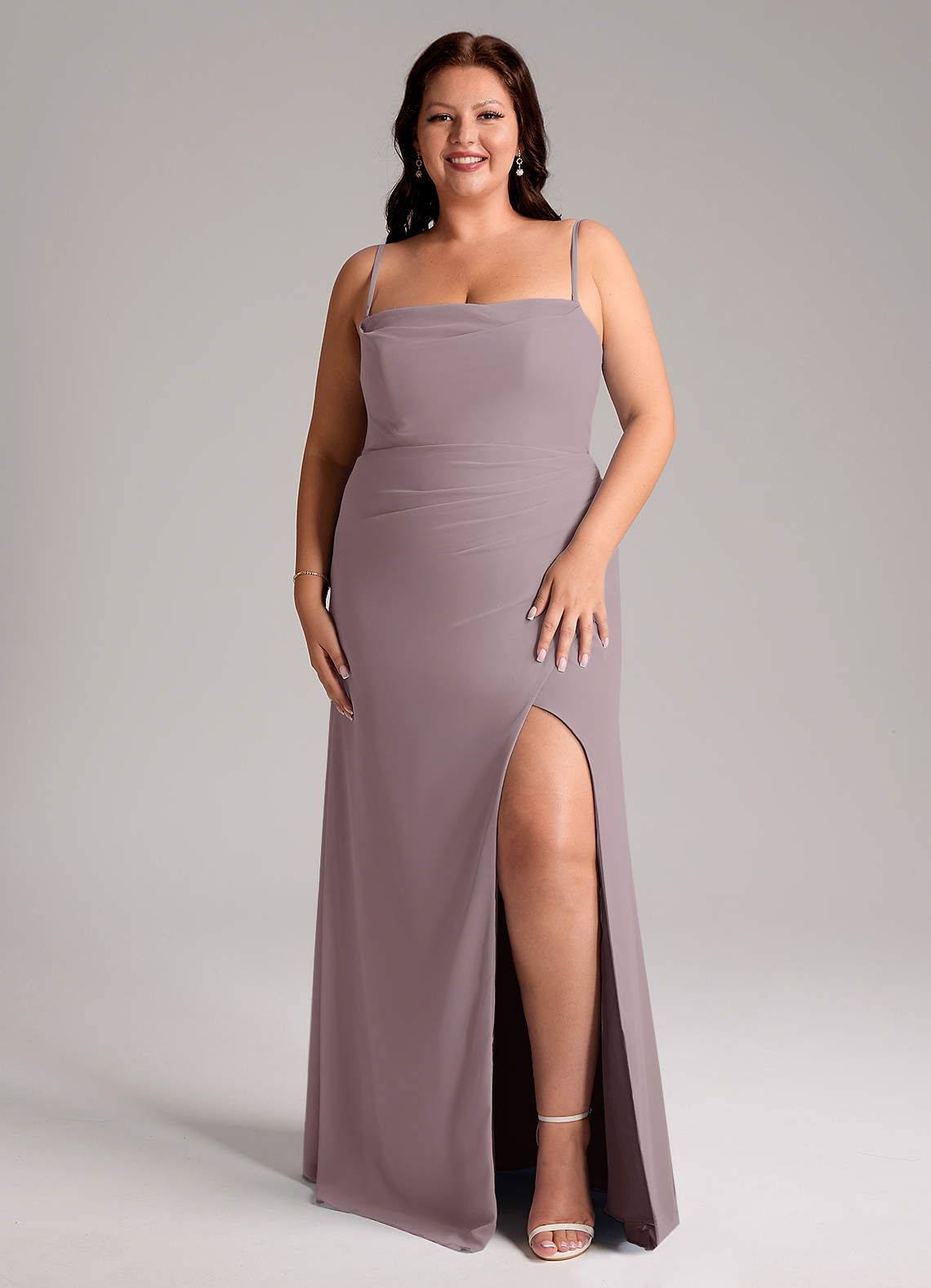 Let your bridesmaids wear our chiffon mermaid dress, Leonis. Her strapless cowl neckline offers removable straps and a bandeau back over a keyhole detail. The skirt has beautiful pleating details over a front leg slit that opens beautifully with every step.