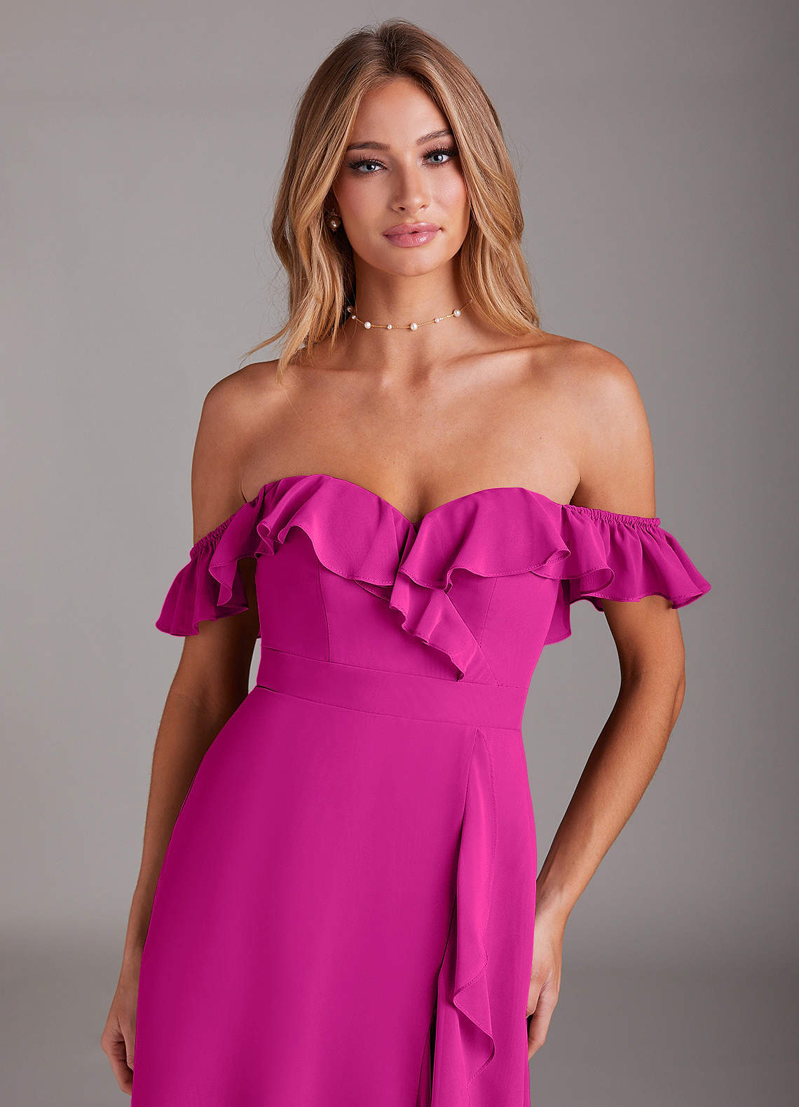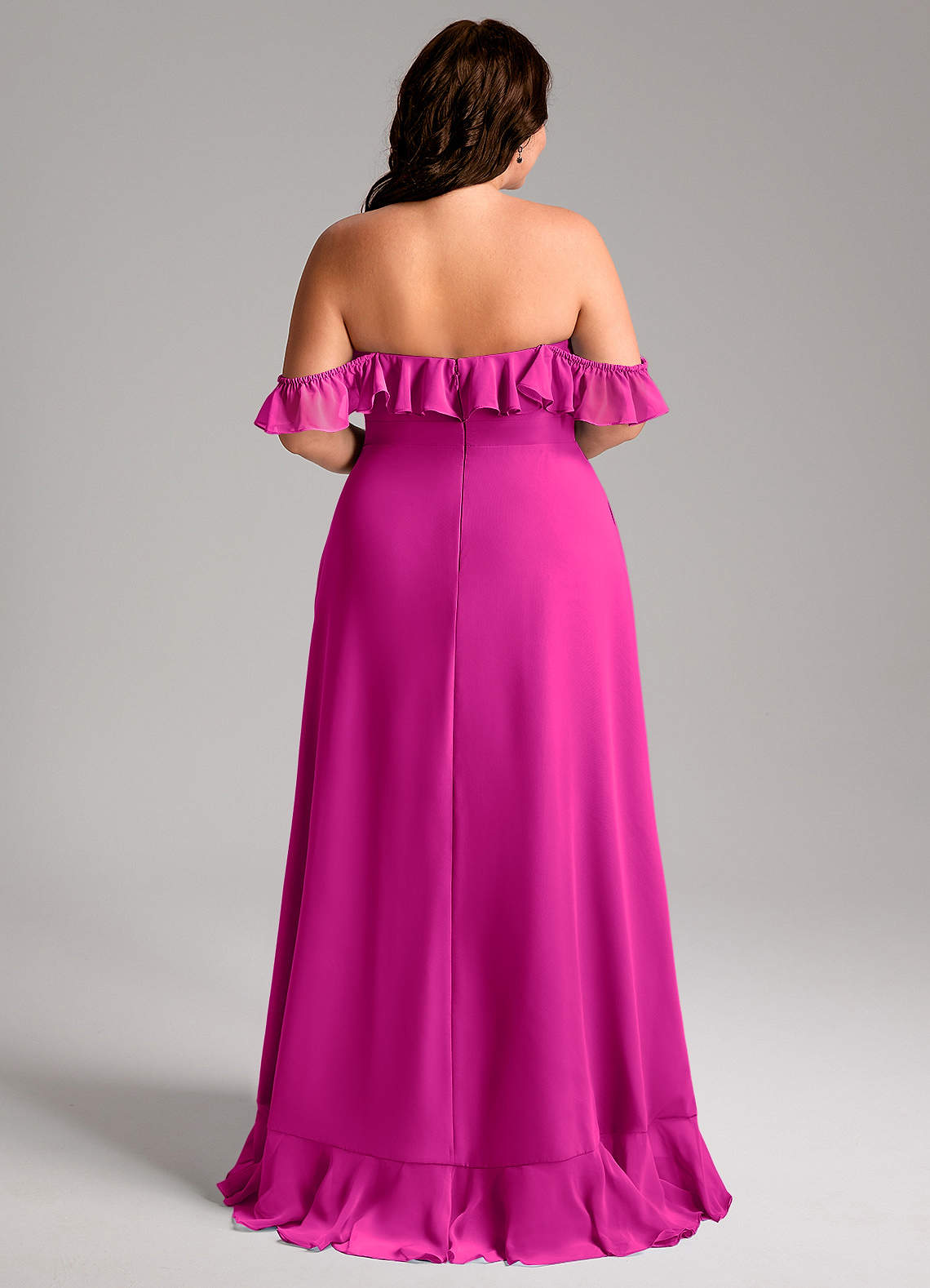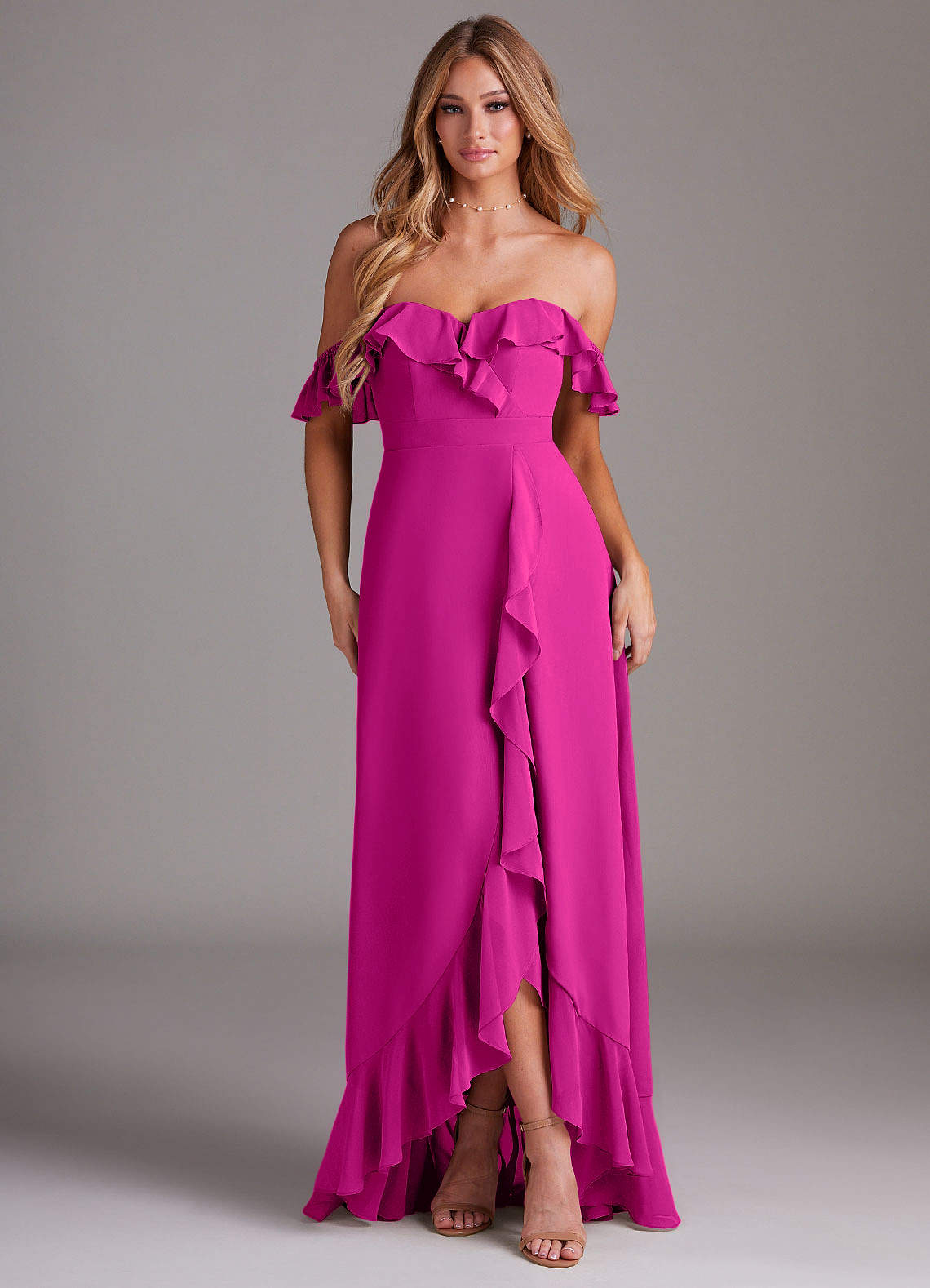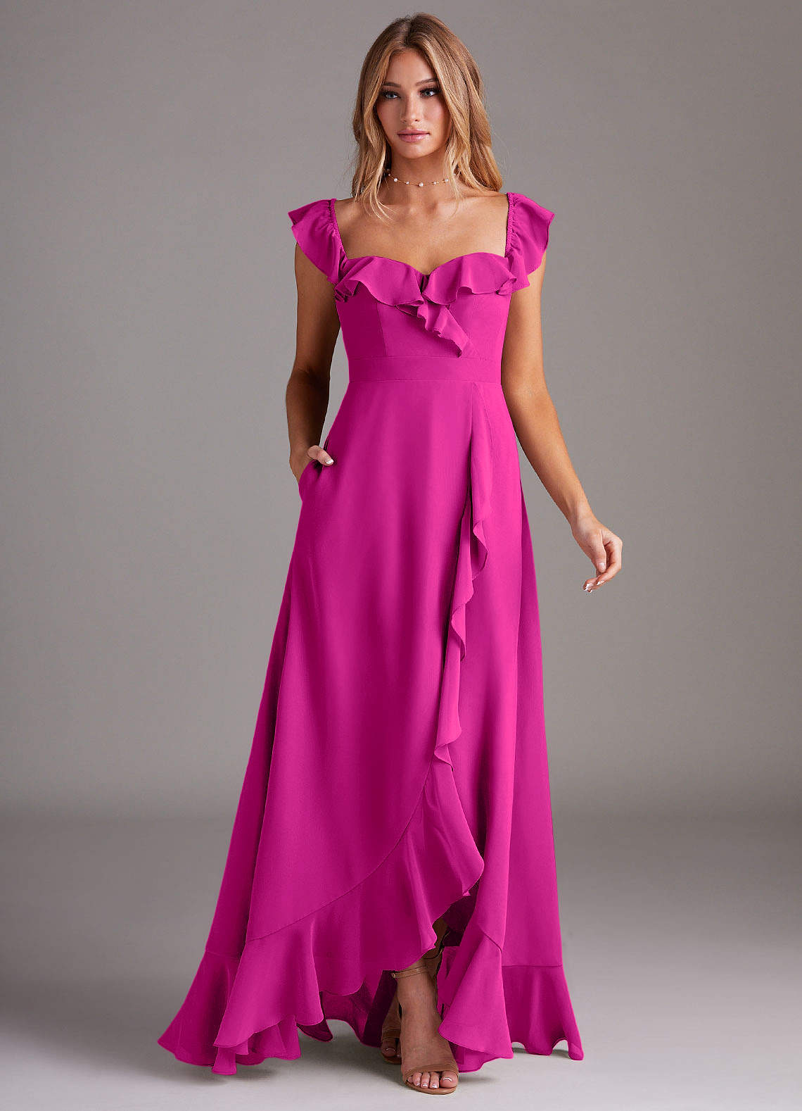 The Lyra bridesmaid dress combines ethereal chiffon with a flattering A-line silhouette, featuring an asymmetrical ruffled hem and a cascading front ruffle that adds a touch of drama. Its romantic ruffled sweetheart neckline and versatile short sleeves can be worn off-the-shoulder or on, making it perfect for any wedding style.