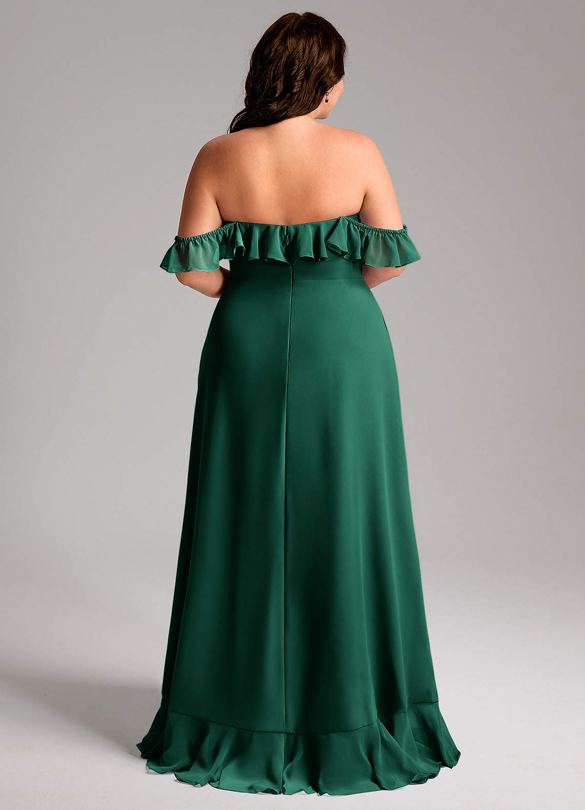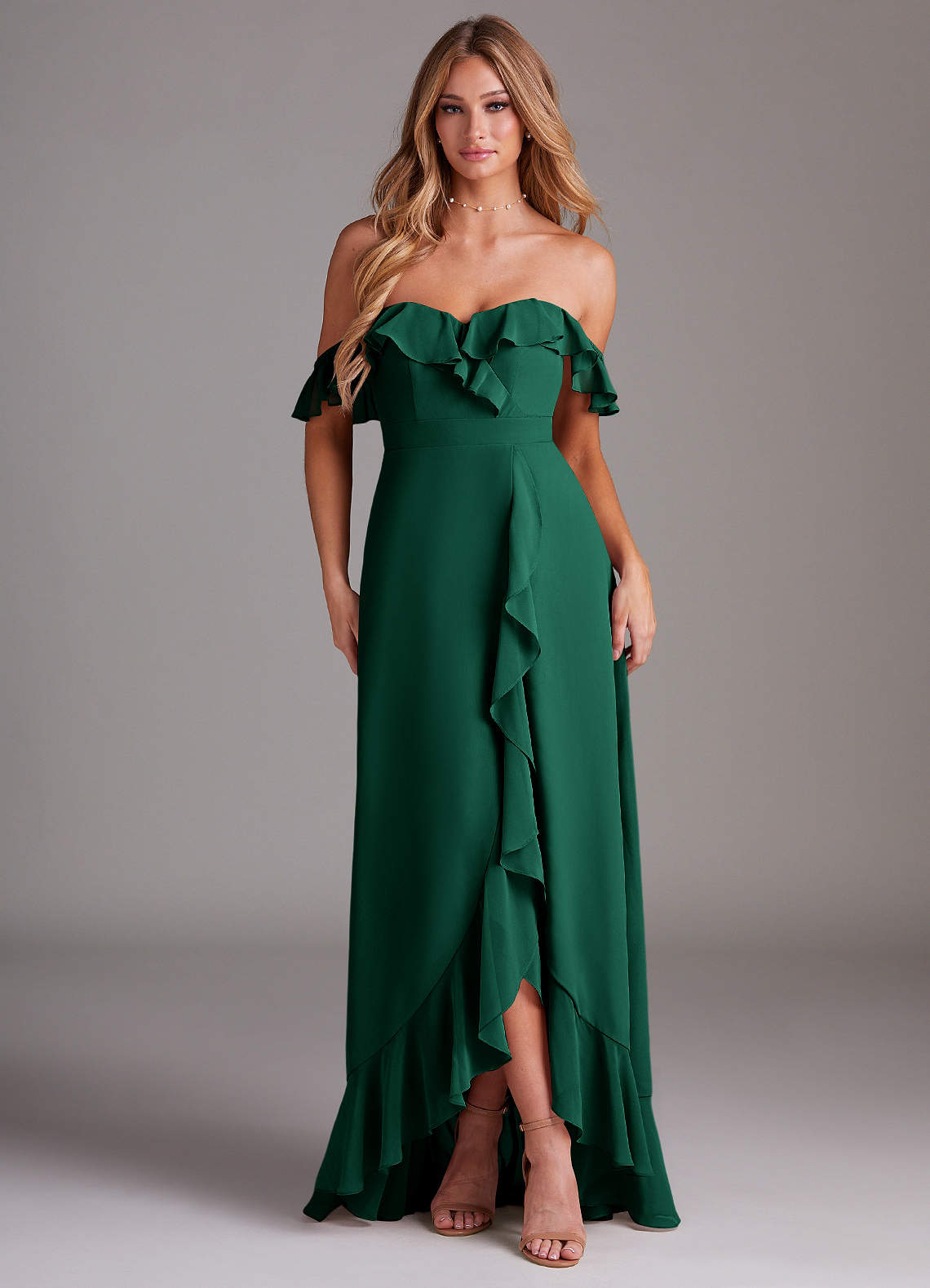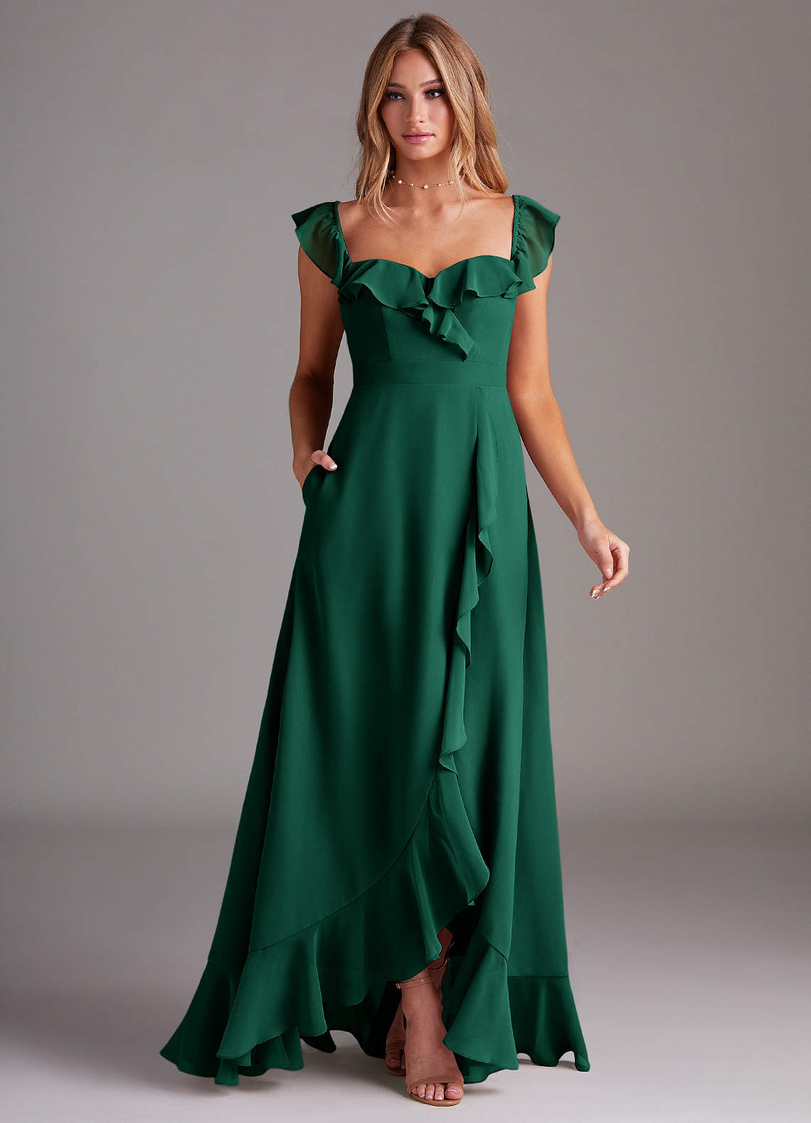 The Lyra bridesmaid dress combines ethereal chiffon with a flattering A-line silhouette, featuring an asymmetrical ruffled hem and a cascading front ruffle that adds a touch of drama. Its romantic ruffled sweetheart neckline and versatile short sleeves can be worn off-the-shoulder or on, making it perfect for any wedding style.