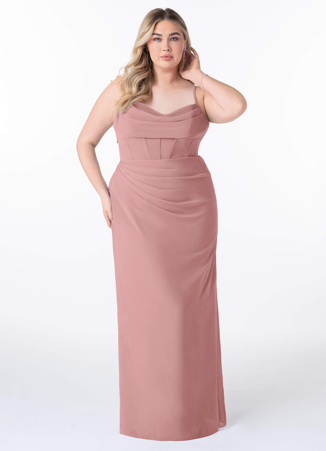 Mai is our fashionable and feminine sheath chiffon dress. Her corseted bodice features a flattering pleated cowl neckline, adjustable spaghetti straps, and a beautiful bow tie back. She also has pleats along her skirt with a side leg slit so you can dance the night away in style.