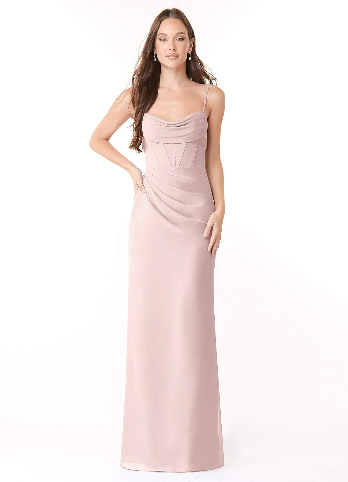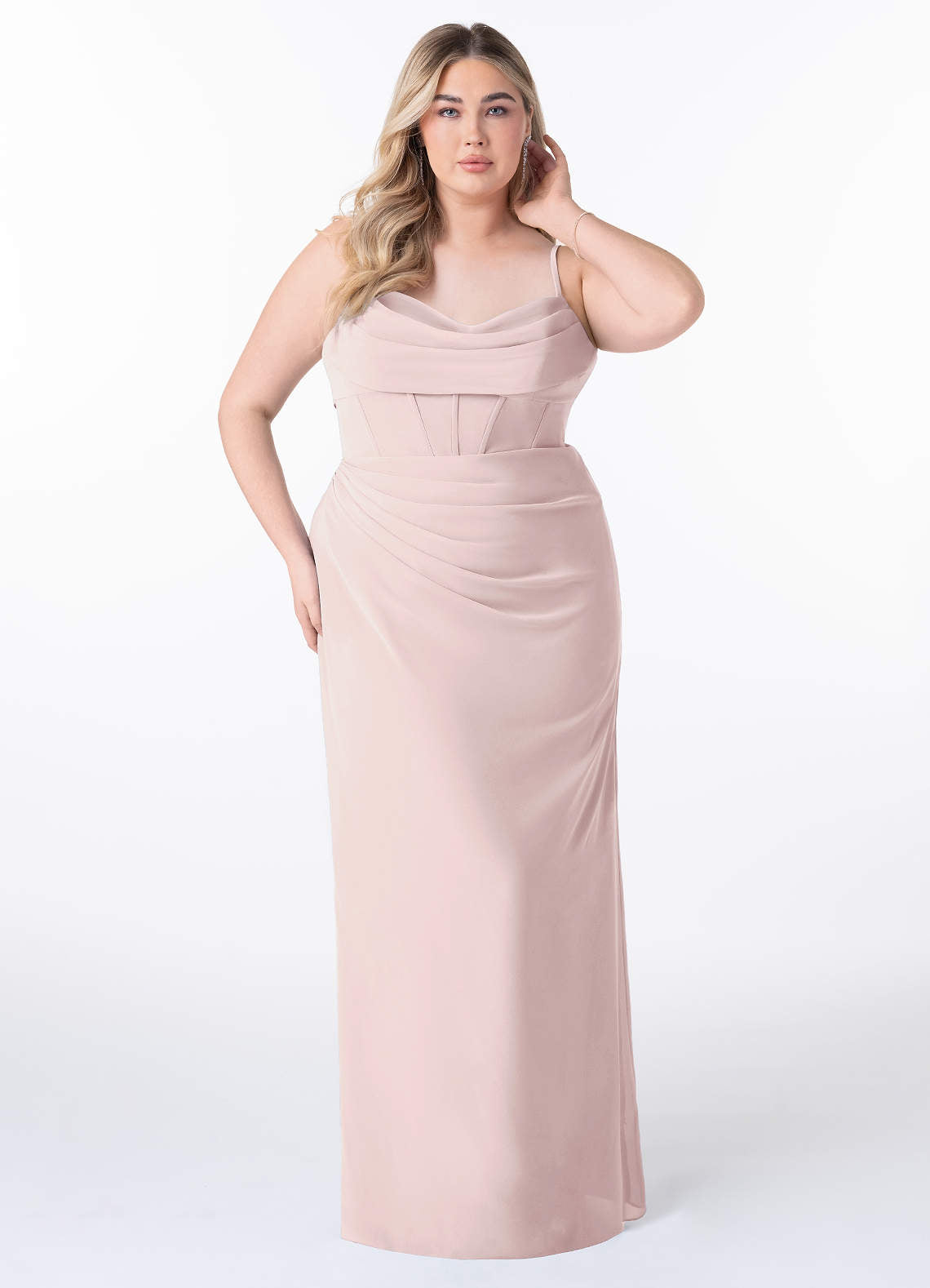 Mai is our fashionable and feminine sheath chiffon dress. Her corseted bodice features a flattering pleated cowl neckline, adjustable spaghetti straps, and a beautiful bow tie back. She also has pleats along her skirt with a side leg slit so you can dance the night away in style.