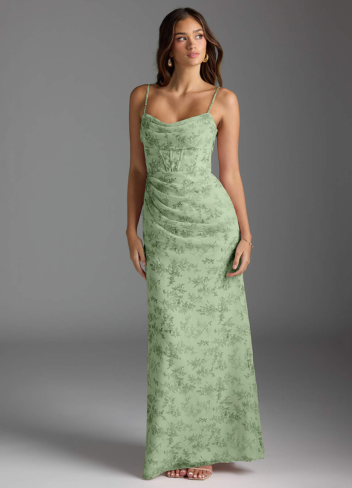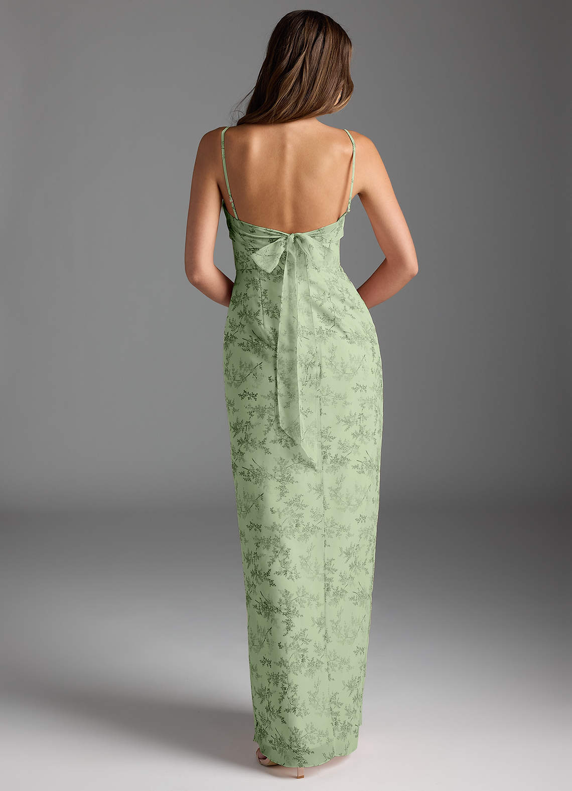 Mai is our fashionable and feminine sheath chiffon dress. Her corseted bodice features a flattering pleated cowl neckline, adjustable spaghetti straps, and a beautiful bow tie back. She also has pleats along her skirt with a side leg slit so you can dance the night away in style.