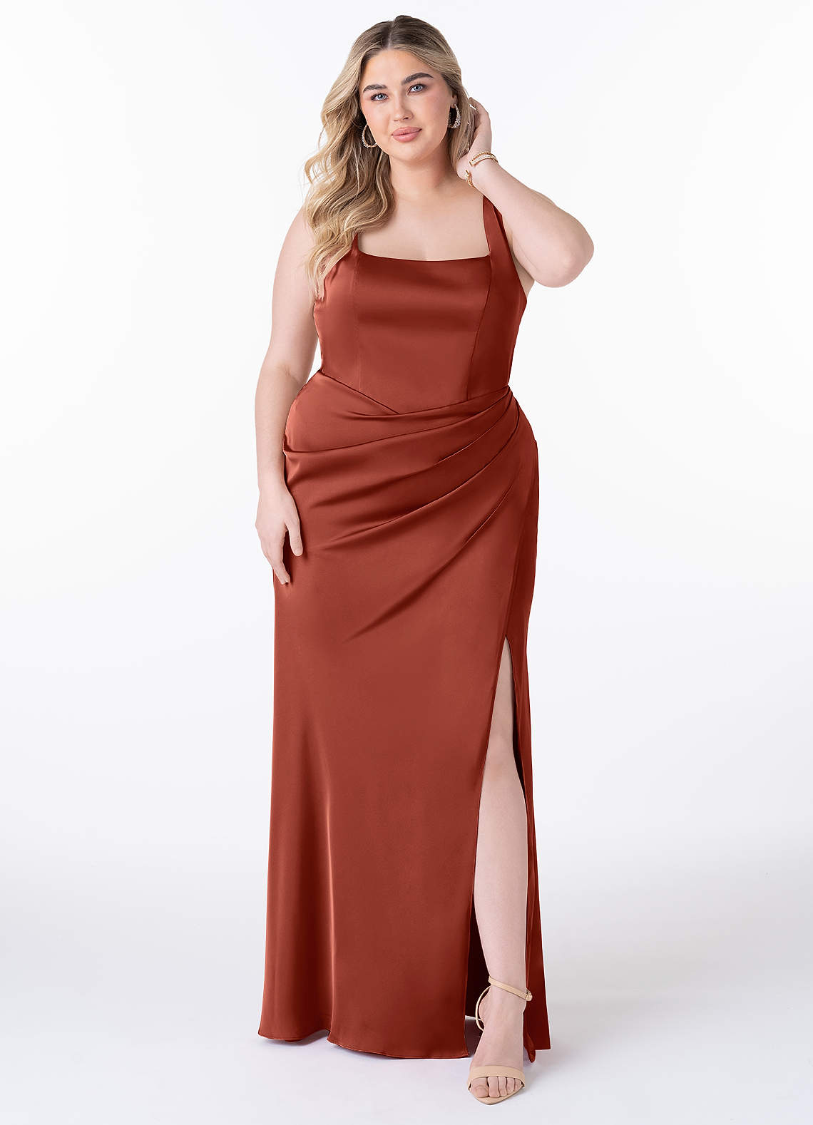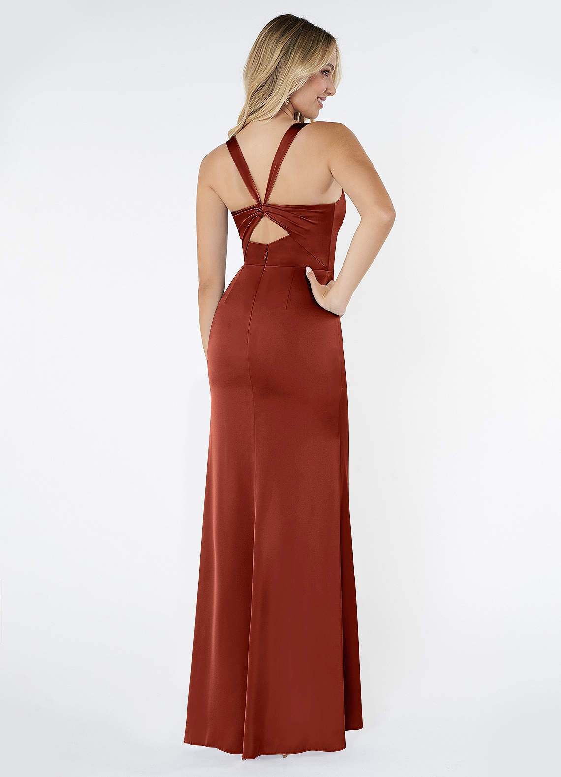 Mero is our stunning bridesmaid dress crafted from stretch satin. She features a square neckline paired with straps leading to a keyhole back. The look is complete with a pleated floor length sheath skirt.