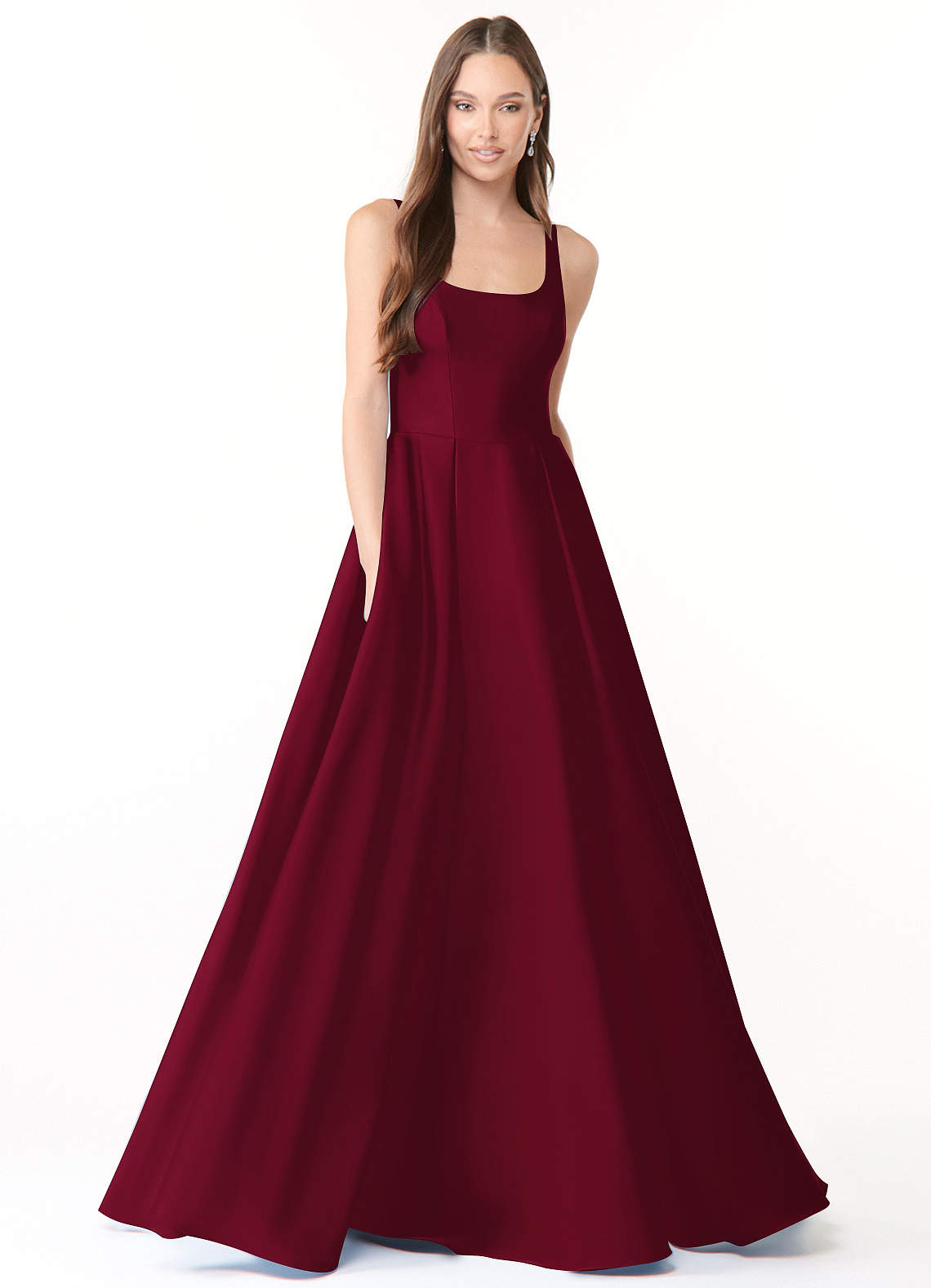 Have your bridesmaids dress beautifully in our stretch satin ball gown. Her square neckline compliments the slightly drop waist and scoop back and is fitted to every silhouette. The skirt flares magically with every step taken. As a bonus she has pockets.