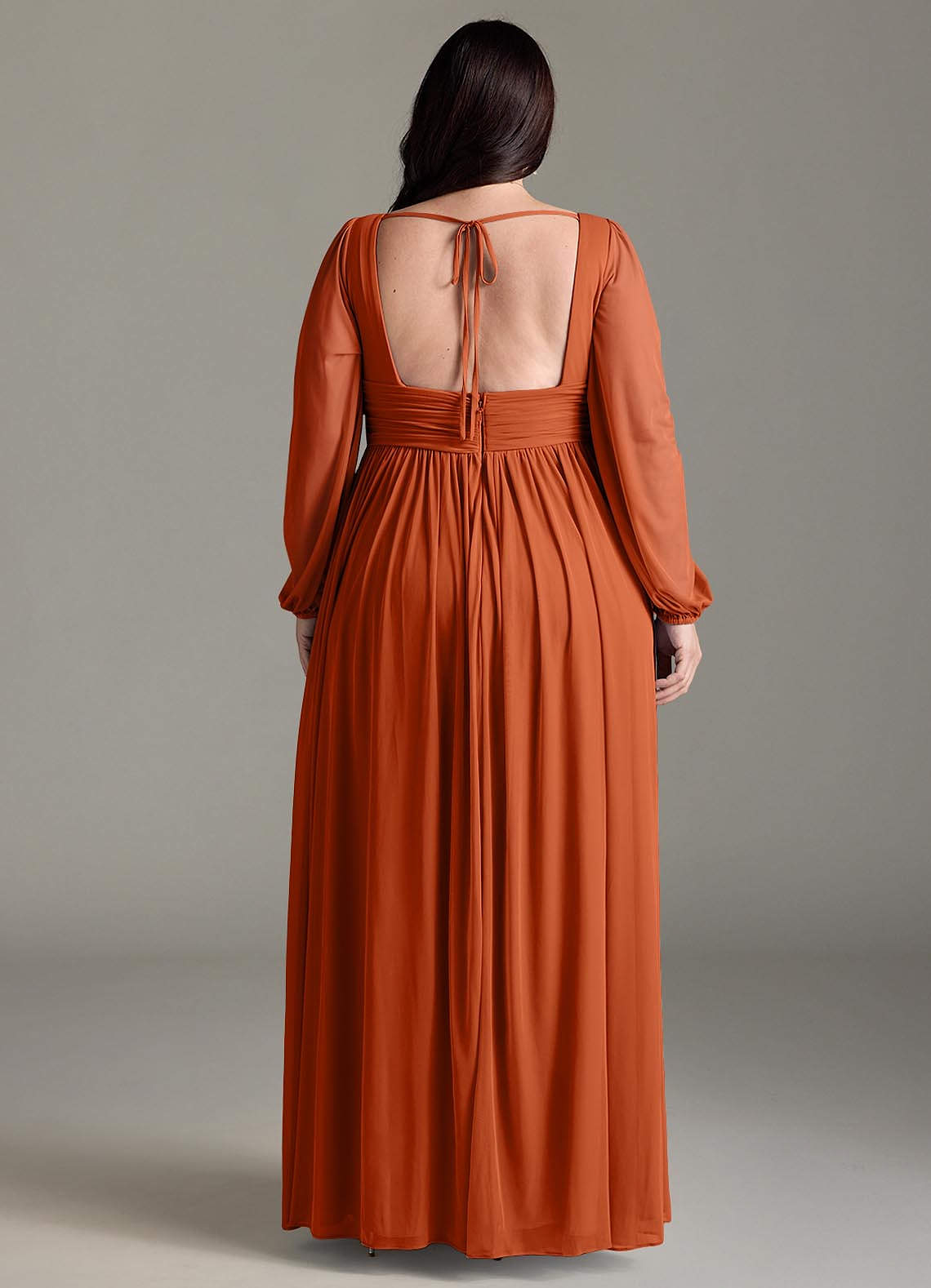 Have your bridesmaids look their best while wearing our A-line chiffon dress, Norah. Her V-neckline has delicate gathering with a pleated empire waistband. Long blouson sleeves compliment the bodice. The gathered A-line skirt flows with every step thanks to the leg slit.