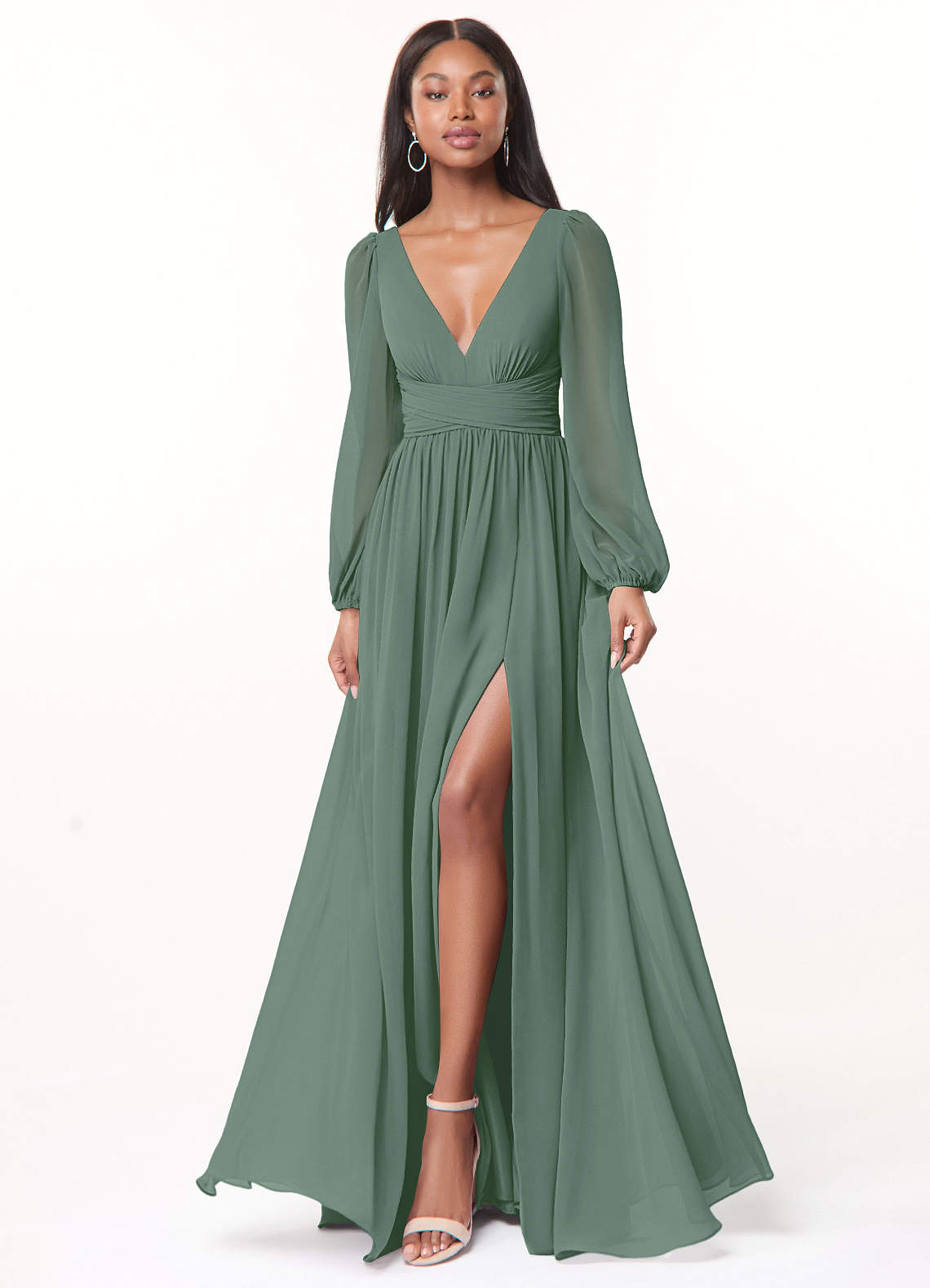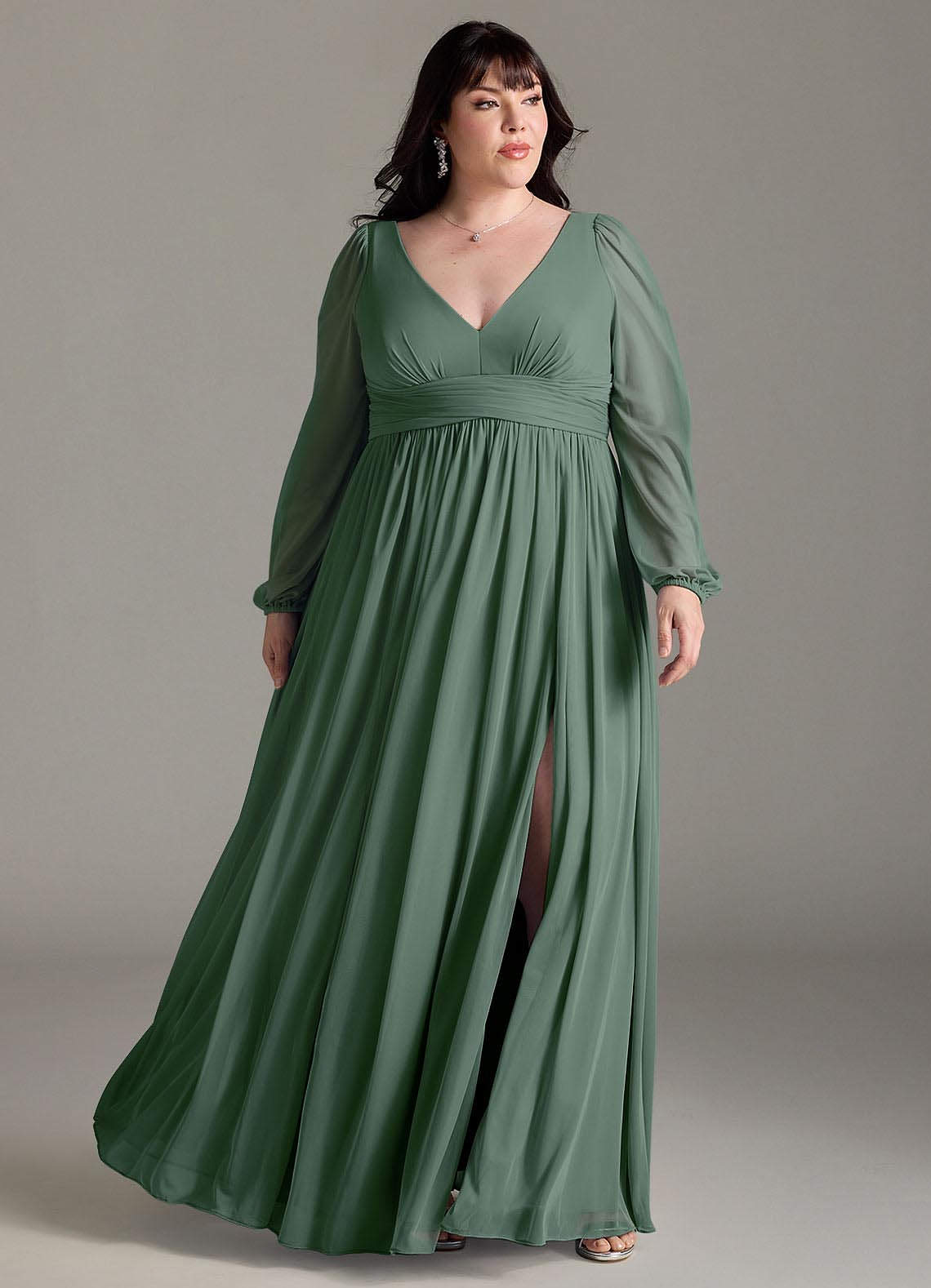 Have your bridesmaids look their best while wearing our A-line chiffon dress, Norah. Her V-neckline has delicate gathering with a pleated empire waistband. Long blouson sleeves compliment the bodice. The gathered A-line skirt flows with every step thanks to the leg slit.