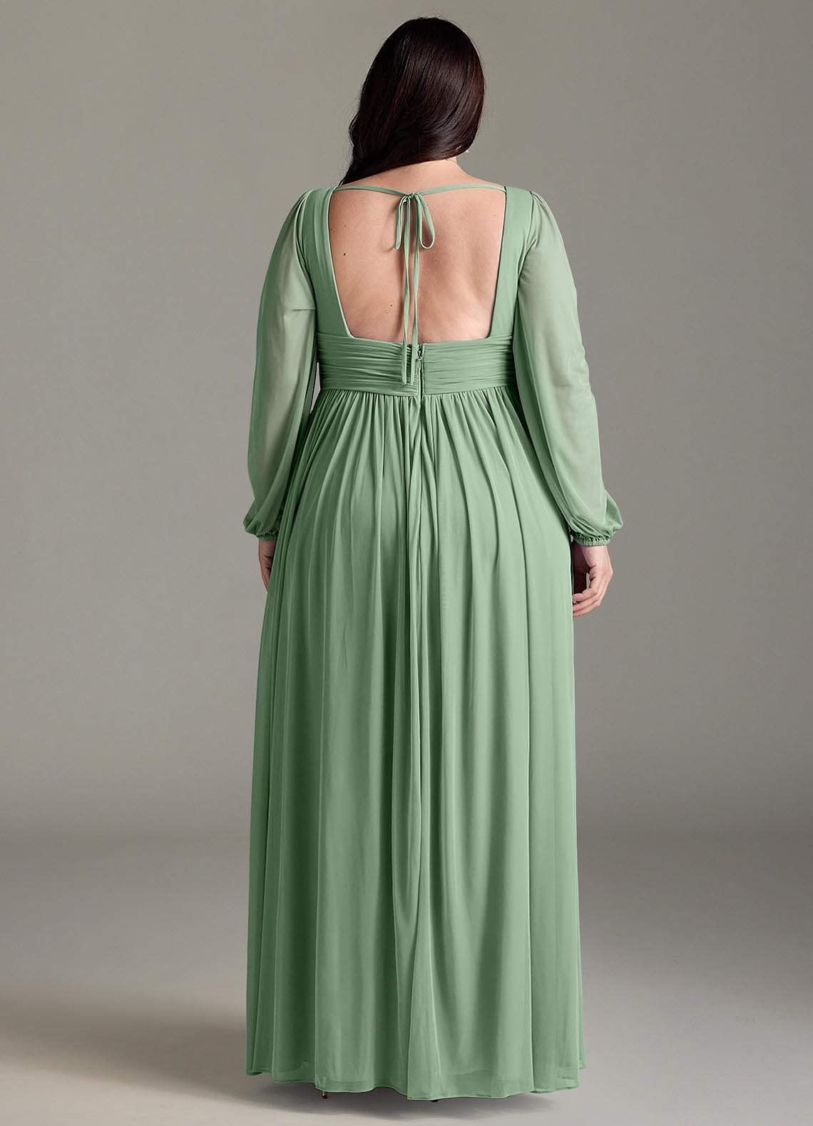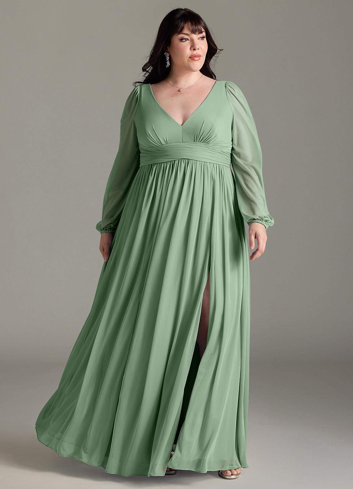Have your bridesmaids look their best while wearing our A-line chiffon dress, Norah. Her V-neckline has delicate gathering with a pleated empire waistband. Long blouson sleeves compliment the bodice. The gathered A-line skirt flows with every step thanks to the leg slit.