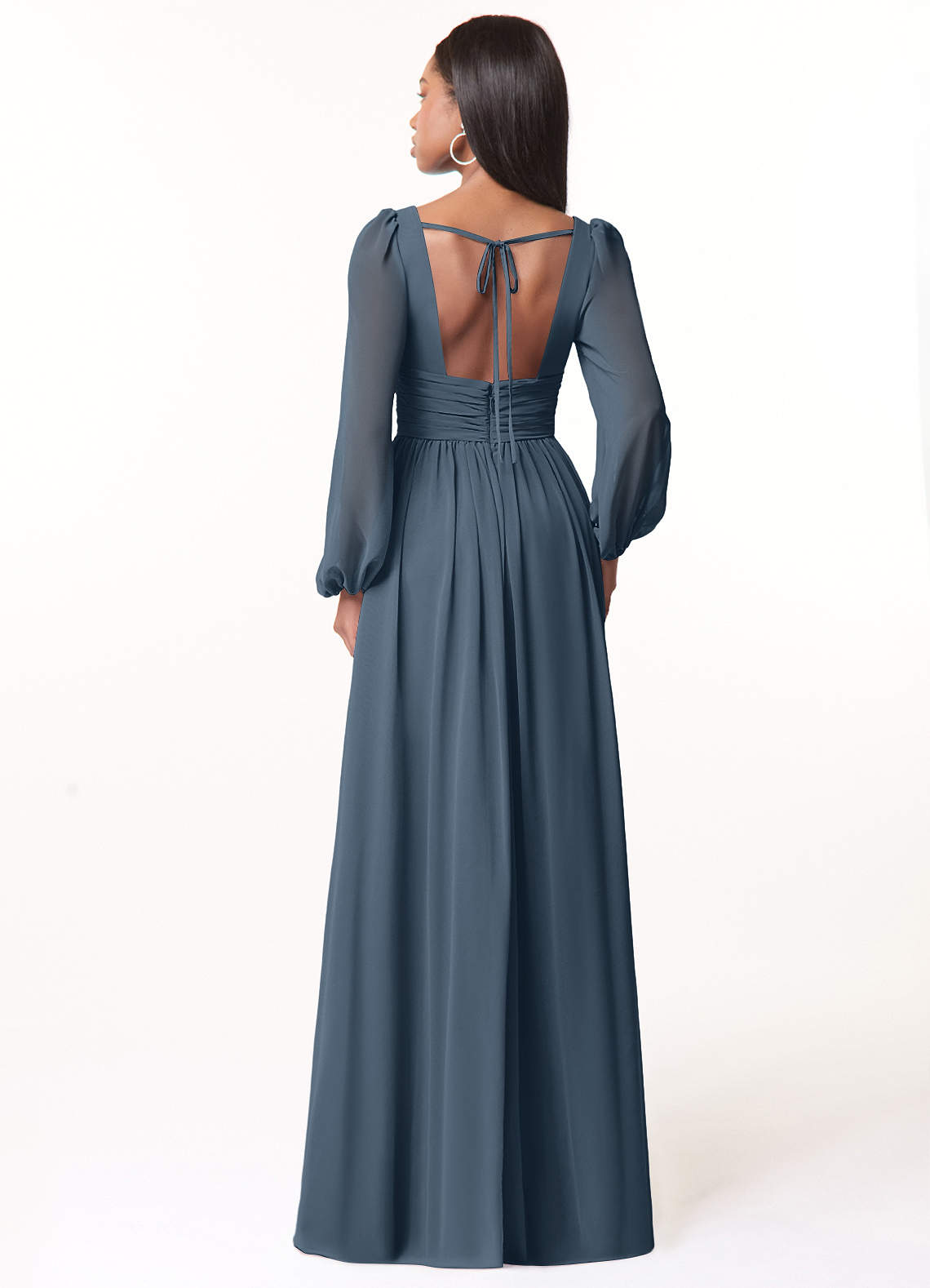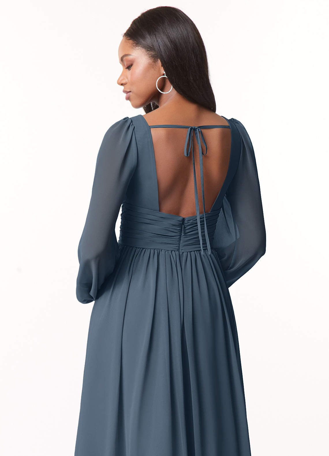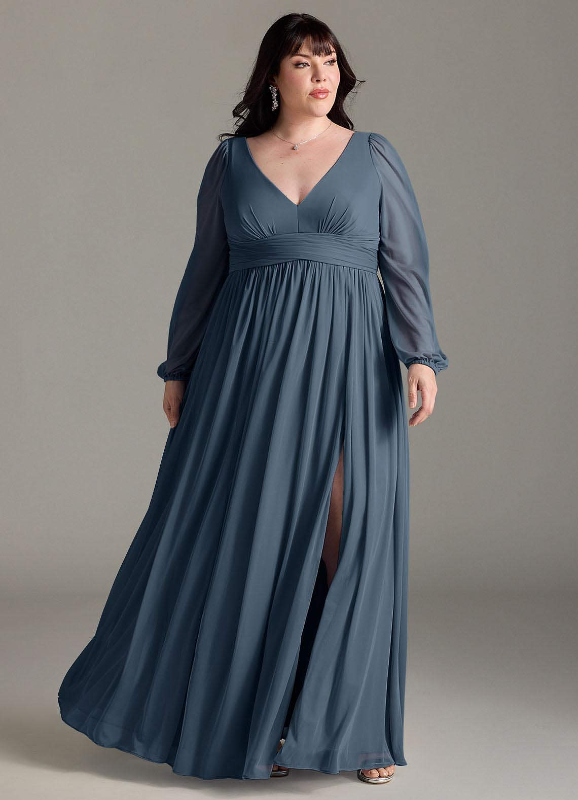 Have your bridesmaids look their best while wearing our A-line chiffon dress, Norah. Her V-neckline has delicate gathering with a pleated empire waistband. Long blouson sleeves compliment the bodice. The gathered A-line skirt flows with every step thanks to the leg slit.