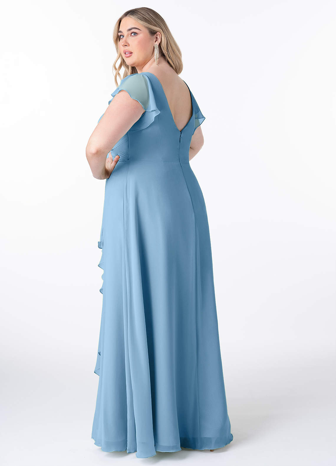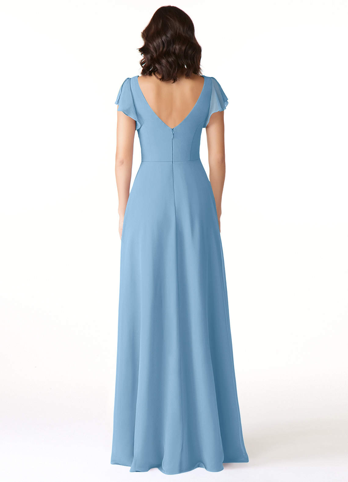 Dance the night away in Omari, our chiffon A-line bridesmaid dress. She features flutter sleeves, a pleated bodice that leads into her V-neckline, and a draped rifle layer over her leg slit.