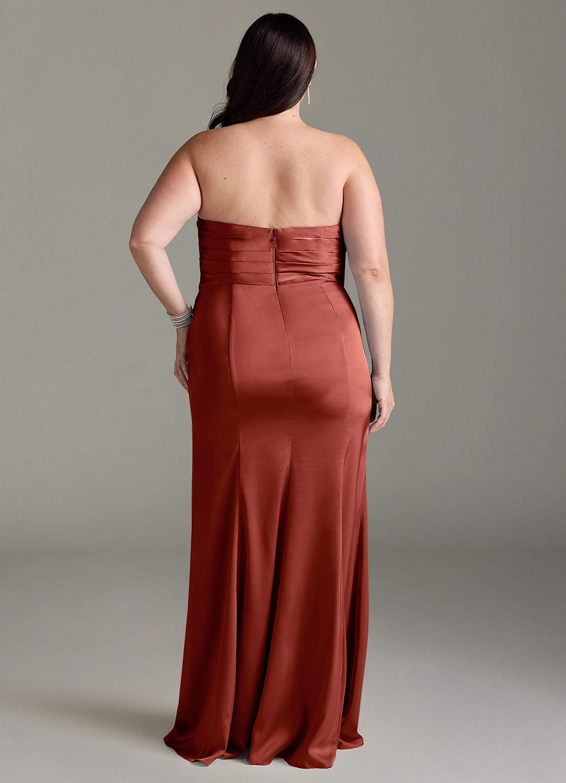 Have your bridesmaids cinched to perfection while they wear our stretch satin mermaid bridesmaid dress, Yola. Her v-neckline has pleats made to cinch the waist while sitting atop delicate pleats that open to a leg slit.